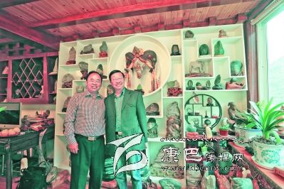 扎西澤仁(左)與州攝協(xié)主席郭昌平在奇石博物架前合影。