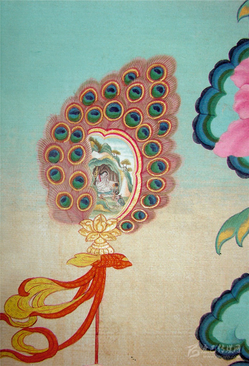 當(dāng)然,我們可以從存世的作品上印證他的這種能力。比如是在《如意寶藤之釋迦牟尼》中:左側(cè)侍女手持一把孔雀羽扇,在羽扇的中央是一塊約四平方厘米的畫屏;在這個(gè)小小的空間里面,郎卡杰描繪了一幅微縮的《修行圖》,圖中米拉日巴正在洞中苦修,洞口蹲伏著獵犬、鹿和獵人。畫中動(dòng)物與人結(jié)構(gòu)準(zhǔn)確,五官準(zhǔn)確,須發(fā)清晰,衣紋細(xì)密流暢;山洞上的樹(shù)木能區(qū)分出樹(shù)干和樹(shù)葉;天空的白云有遠(yuǎn)近層次。在這不足盈寸的空間里,用毛筆刻畫這般細(xì)致,令人嘆為觀止。