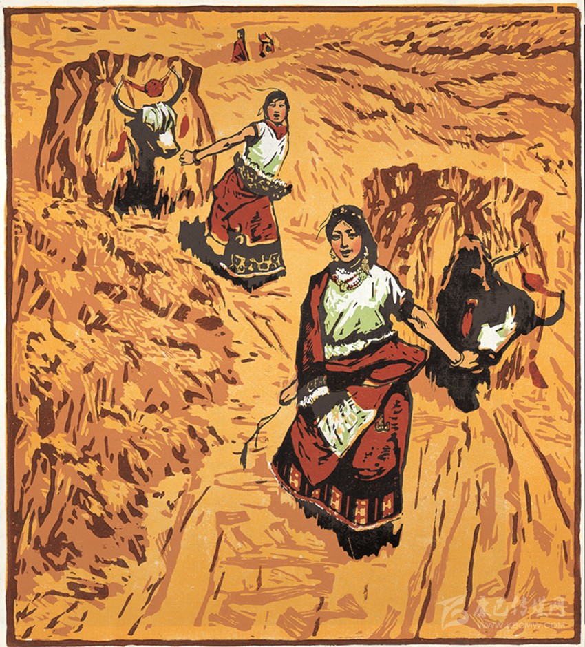 版畫家李煥民曾說(shuō):“在水乳交融的生活中,藏族人民以樸實(shí)、友好、慈愛,哺育了一代代美術(shù)工作者?!迸c40年代進(jìn)藏的前輩大師所不同的是,這批新中國(guó)的畫家進(jìn)藏后不再以畫者的角度來(lái)欣賞西藏,而是與藏民同吃、同住、同勞動(dòng),深刻地體會(huì)藏民的生活和精神世界。他們走進(jìn)西藏,就是一次次以平等、學(xué)習(xí)、尊敬的態(tài)度和藏族同胞一起生活、一起唱歌跳舞,所以他們對(duì)西藏人民的感情充滿真摯。當(dāng)然,這也是一個(gè)漫長(zhǎng)且辛苦的過(guò)程。但正是這個(gè)艱辛過(guò)程,使得他們的作品更加真實(shí)和接地氣,他們把民族精神、民族團(tuán)結(jié)、積極向上的時(shí)代魂魄留在他們的作品里,也成為他們藝術(shù)生涯的經(jīng)典之作。
