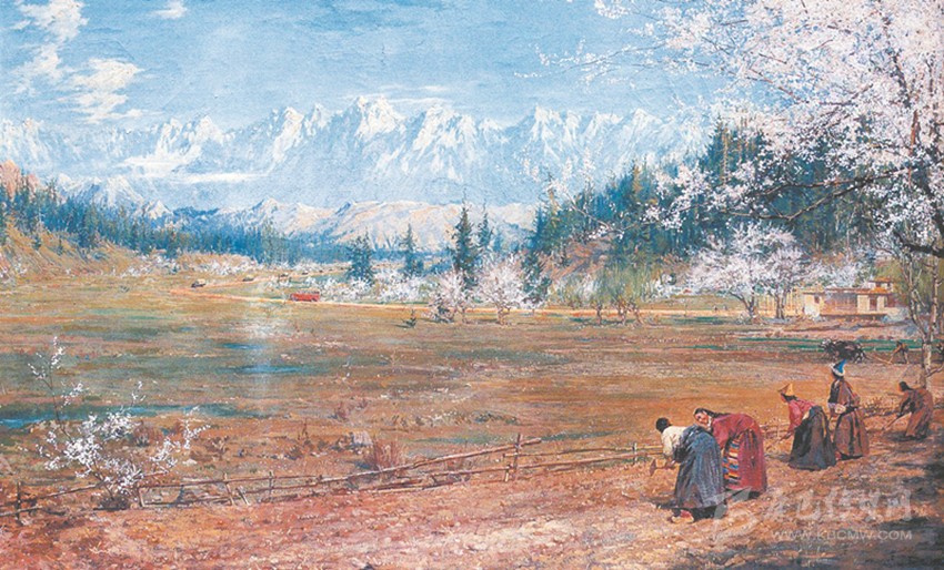 “西藏題材繪畫”主要是指內(nèi)地畫家從外部來(lái)關(guān)照西藏、表現(xiàn)西藏的繪畫作品。西藏題材繪畫經(jīng)歷了幾個(gè)不同的歷史時(shí)期:20世紀(jì)40年代,是內(nèi)地畫家初涉藏地采風(fēng),并在作品里反映青藏高原的風(fēng)土人情,讓觀眾去想象西藏民族的生活狀態(tài)。而在50-60年代的西藏題材繪畫作品里,承載的是西藏的社會(huì)巨變,以及當(dāng)時(shí)西藏人的時(shí)代風(fēng)貌。從80年代開始的“西藏?zé)帷本劢褂诓厝藢?duì)自然的尊重和敬畏,以及對(duì)“和諧共存”精神的贊揚(yáng)等等。