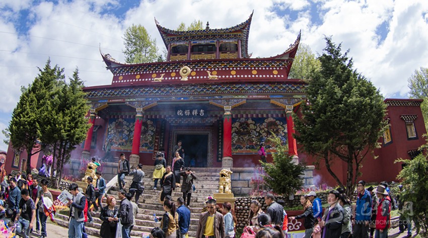 走下石欄,是一處曲廊環(huán)繞的圓形跑馬坪,坪中心為表演場地,外沿是憩息迴廊,坪的上方是一座用水泥澆鑄的藏族騎士策馬騰空的雕像,象征藏族入民揚鞭催馬向四化路上飛奔。繞過跑馬坪,便是浴佛池”,據(jù)傳“四月八”這天是佛祖釋迦牟尼的生辰,有九龍吐水為之沐浴,故稱此日為“浴佛節(jié)”。