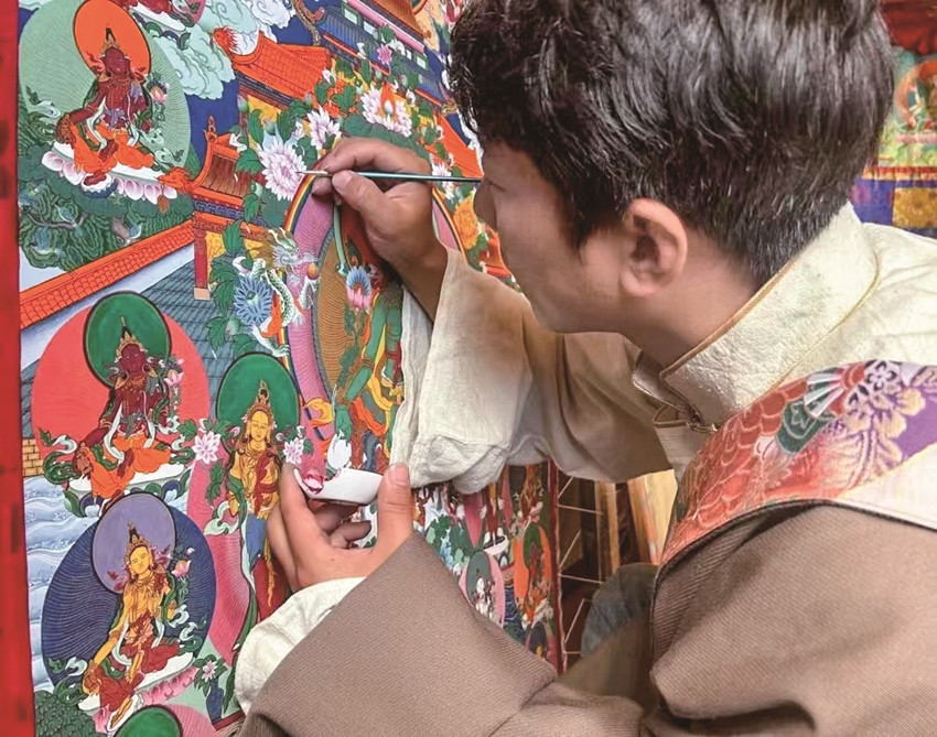 “唐卡作為中國民族繪畫藝術(shù)的珍品,不僅呈現(xiàn)精湛的技藝和美學(xué),更是傳遞一種文化。”楊登表示,他作為一名縣級非遺傳承人,要在繼承傳統(tǒng)技藝的基礎(chǔ)上,采用多元藝術(shù)技藝賦予傳統(tǒng)唐卡更多創(chuàng)意,讓民族文化瑰寶能夠更好地發(fā)揚光大。