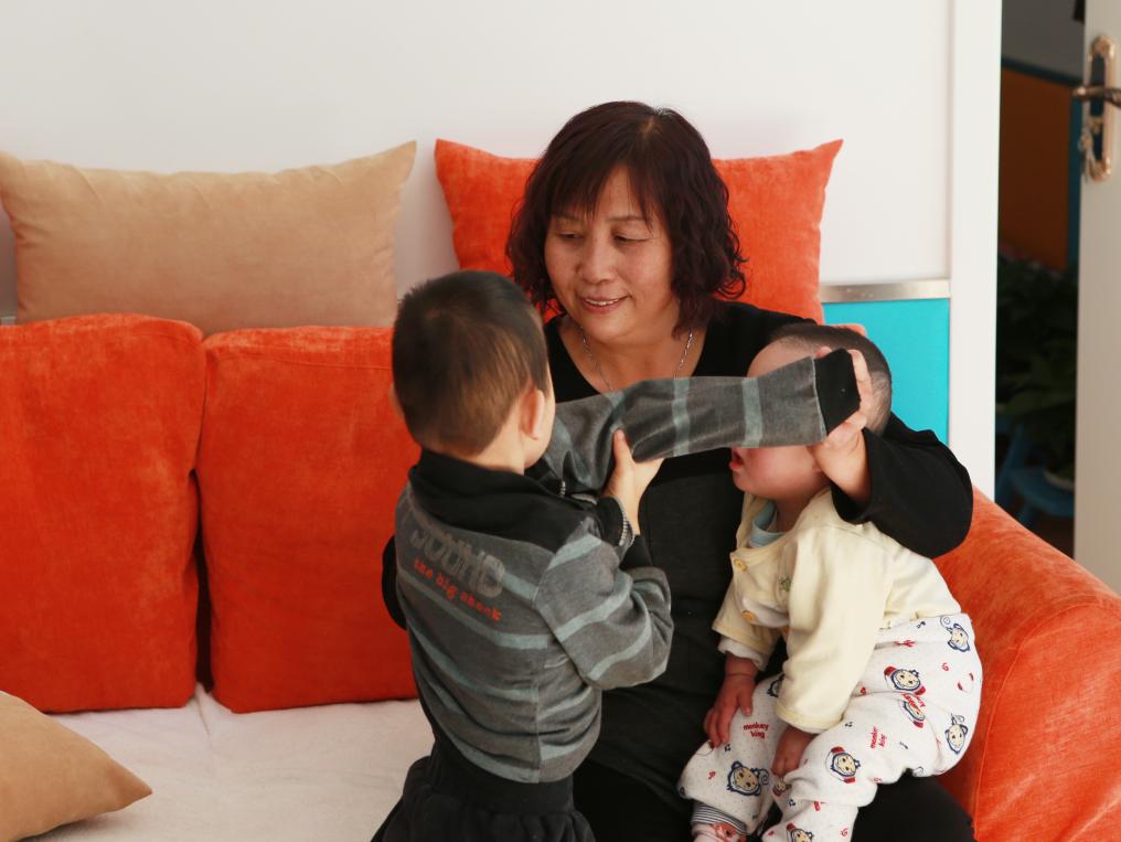 ??2017年11月3日,內(nèi)蒙古呼和浩特市兒童福利院里,“愛(ài)心媽媽”景鳳英抱著兩個(gè)孩子。新華社記者 王婧嬙 攝