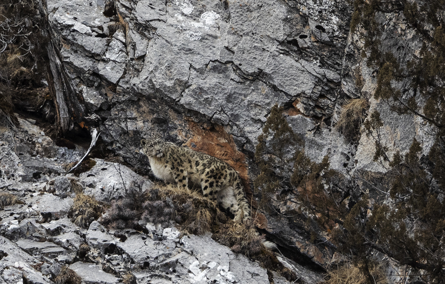 ??2023年2月21日,在青海省玉樹藏族自治州雜多縣昂賽鄉(xiāng)境內(nèi)的昂賽大峽谷內(nèi),一只雪豹準備向上攀爬。新華社記者 費茂華 攝