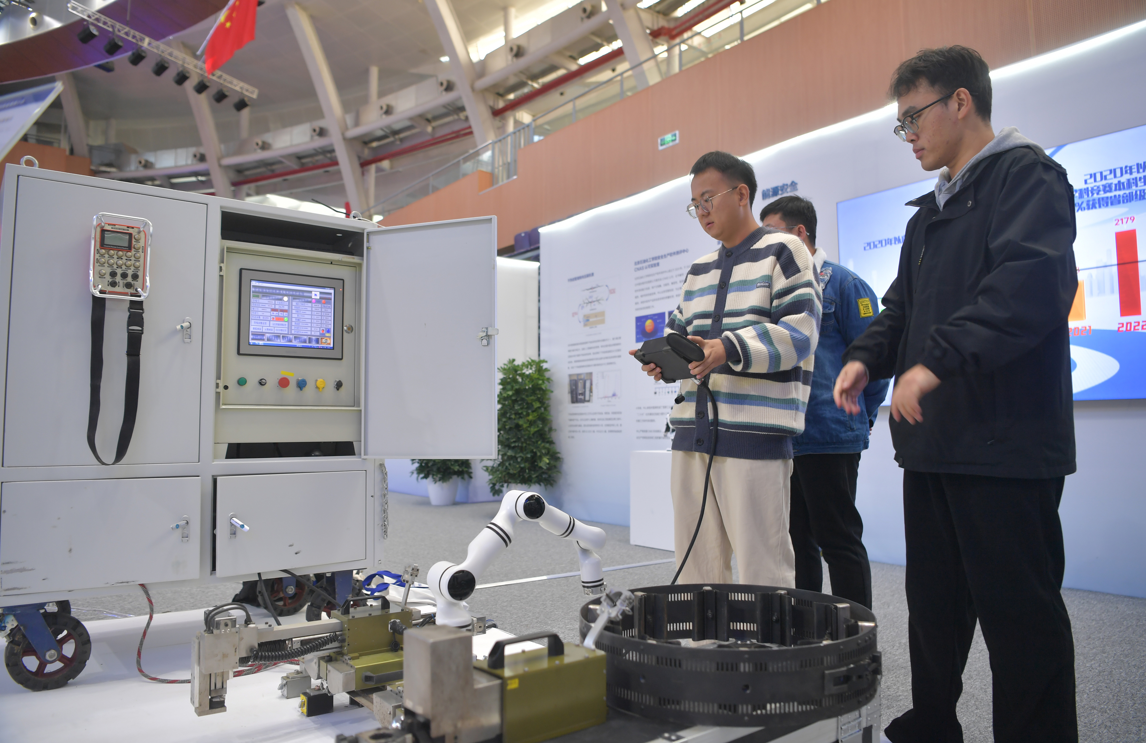 2023年,京南地區(qū)高校科技成果推介會在北京建筑大學大興校區(qū)舉行。圖為高校師生在展示管道全位置焊接機器人系統(tǒng)成果。