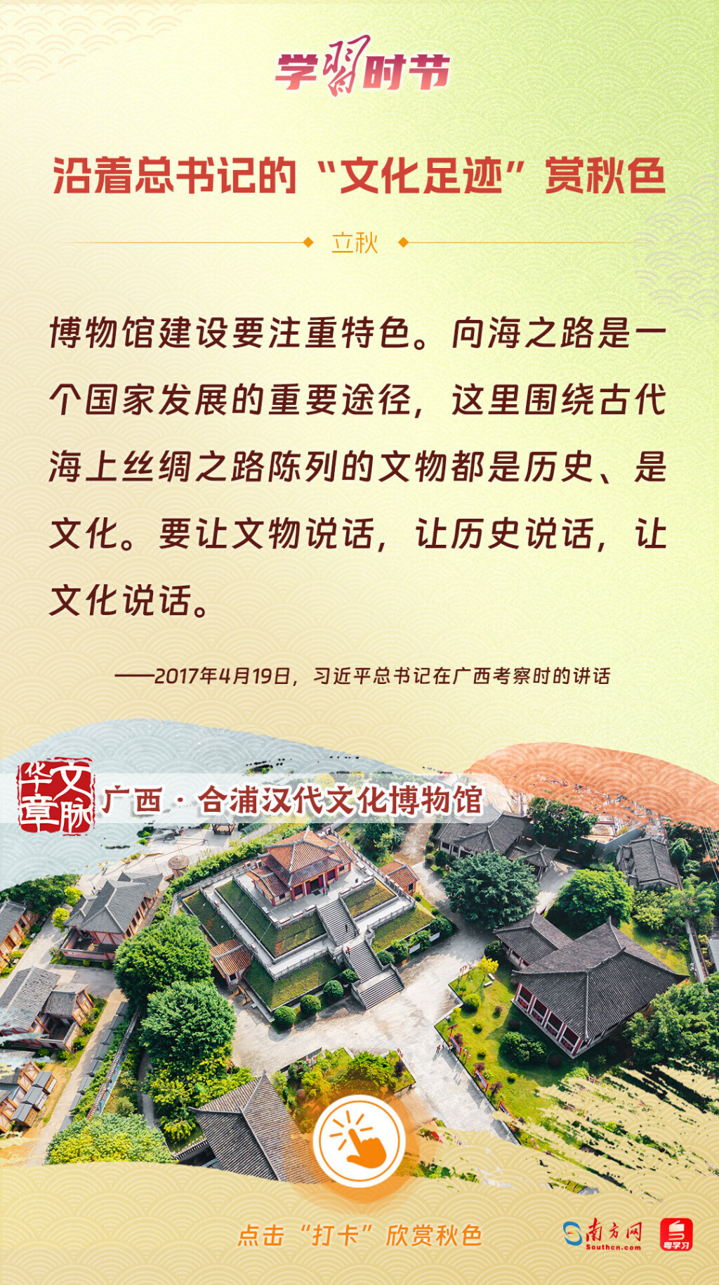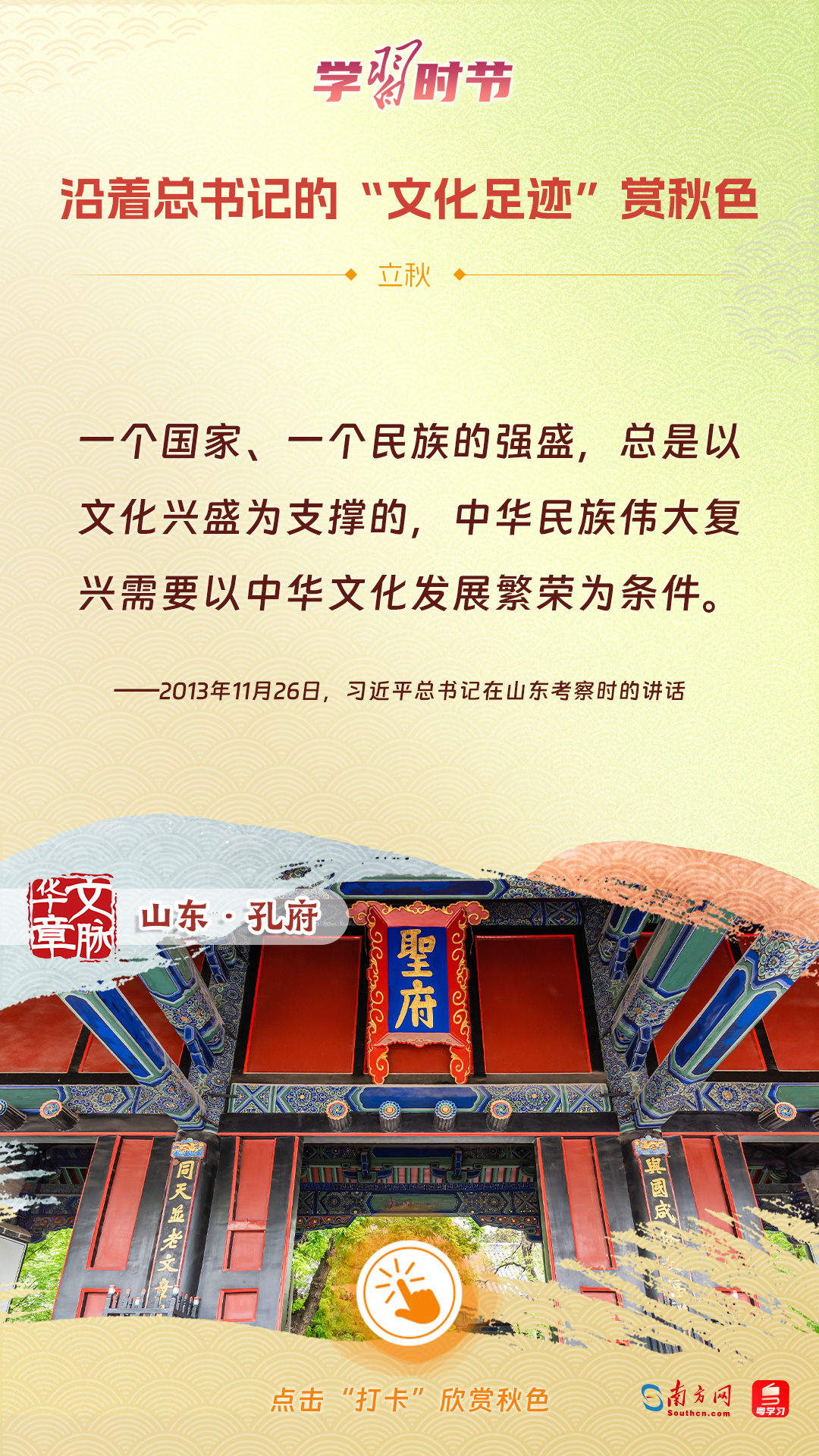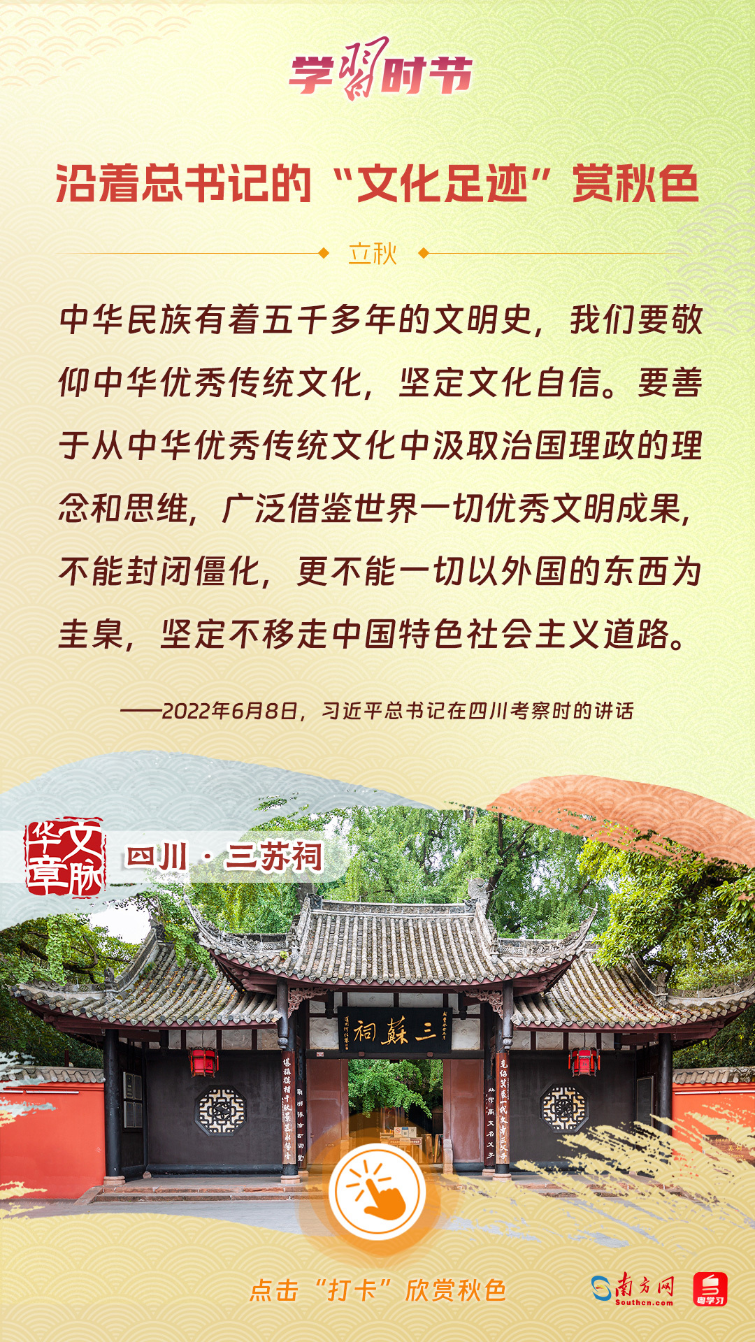 立秋之際,讓我們一起跟隨習(xí)近平總書記的足跡,學(xué)習(xí)習(xí)近平總書記關(guān)于文化建設(shè)的重要論述,感受全國各地文化地標(biāo)古跡的秋意,汲取文化自信的強大力量。