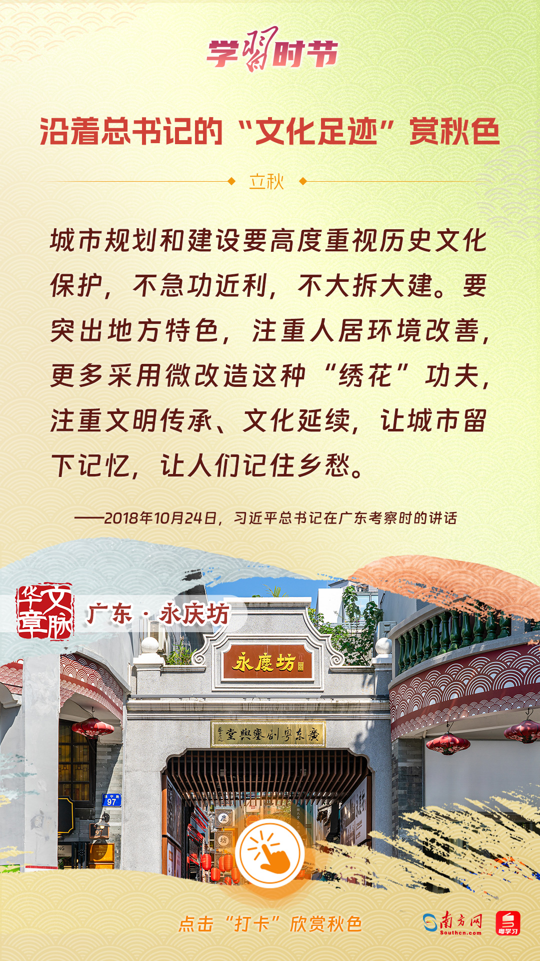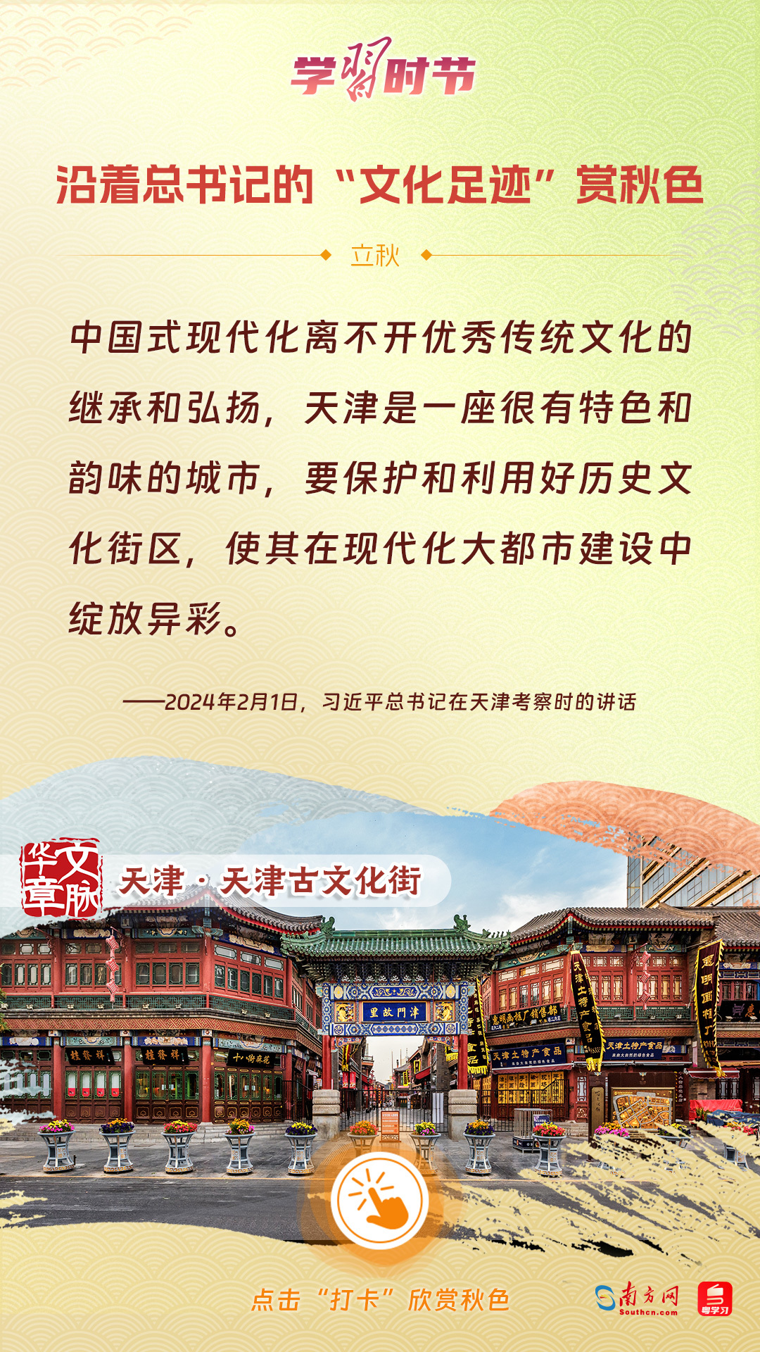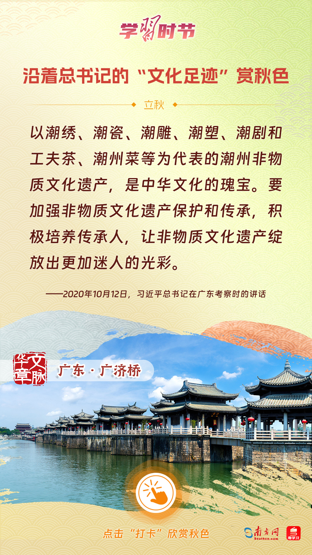立秋之際,讓我們一起跟隨習(xí)近平總書記的足跡,學(xué)習(xí)習(xí)近平總書記關(guān)于文化建設(shè)的重要論述,感受全國各地文化地標(biāo)古跡的秋意,汲取文化自信的強大力量。