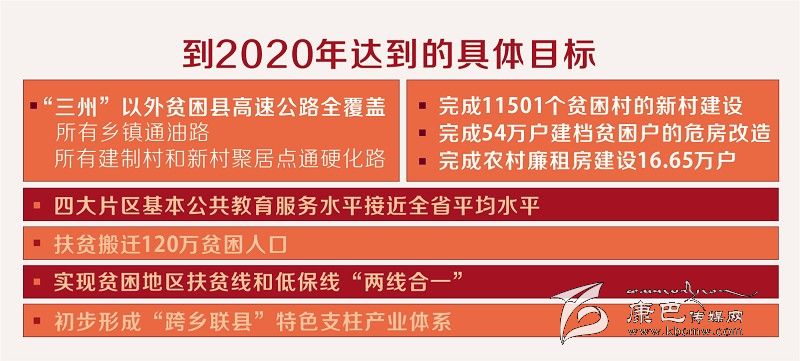 方案提出,到2020年“三州”以外貧困縣高速公路全覆蓋,所有鄉(xiāng)鎮(zhèn)通油路、所有建制村和新村聚居點(diǎn)通硬化路;完成11501個(gè)貧困村的新村建設(shè),全面完成54萬戶建檔貧困戶的危房改造,完成農(nóng)村廉租房建設(shè)16.65萬戶;四大片區(qū)基本公共教育服務(wù)水平接近全省平均水平;扶貧搬遷120萬貧困人口;實(shí)現(xiàn)貧困地區(qū)扶貧線和低保線“兩線合一”;初步形成“跨鄉(xiāng)聯(lián)縣”特色支柱產(chǎn)業(yè)體系等多項(xiàng)具體目標(biāo)。最終,確保省委提出的497.65萬農(nóng)村貧困人口全部脫貧、11501個(gè)貧困村和88個(gè)貧困縣全部“摘帽”,貧困縣農(nóng)民人均純收入比2010年翻一番以上,實(shí)現(xiàn)基本公共服務(wù)均等化、社會保障全覆蓋的目標(biāo)全面實(shí)現(xiàn)。