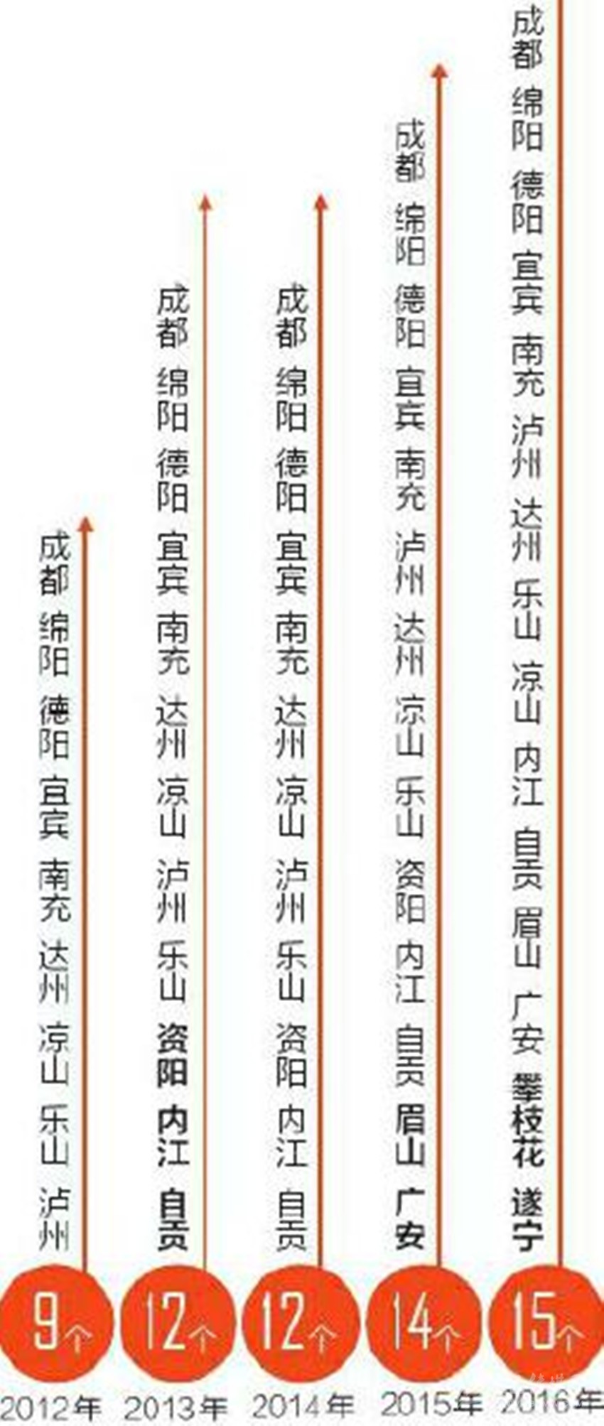 2012年,全省GDP過千億的市州只有9個,到2016年已經(jīng)達到15個。除成都外,14個市州都在1000億元到2000億元之間,相鄰兩個市州的平均差距只有60億元左右,最大差距不到100億元,最小差距只有1億多元。