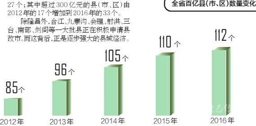 放眼全省,2016年,GDP突破百億元大關(guān)的縣(市、區(qū))112個,比2012年增加27個;其中超過300億元的縣(市、區(qū))由2012年的17個增加到2016年的33個。