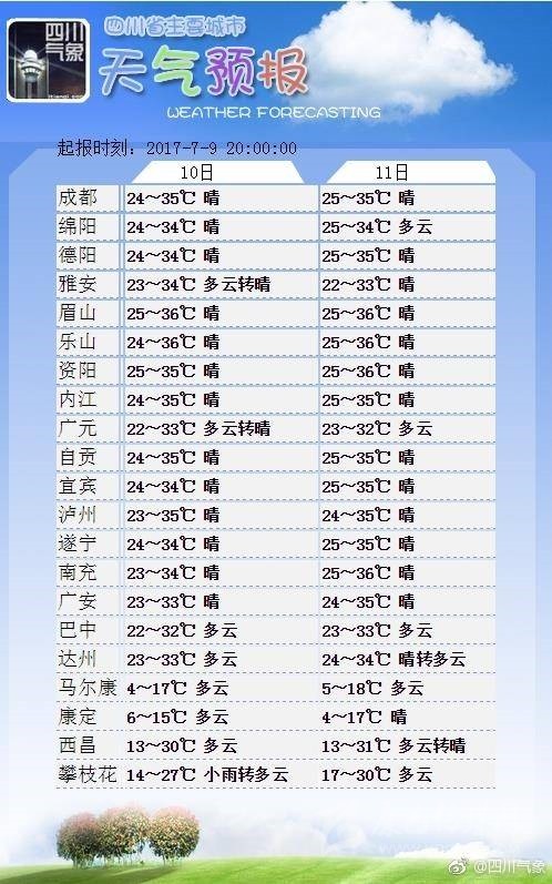 10日晚上到11日白天:盆地各市晴間多云,其中北部部分地方有分散性陣雨或雷雨;川西高原多云間陰天,大部分地方有陣雨或雷雨,其中甘孜州西南部有中雨,攀西地區(qū)晴間多云。