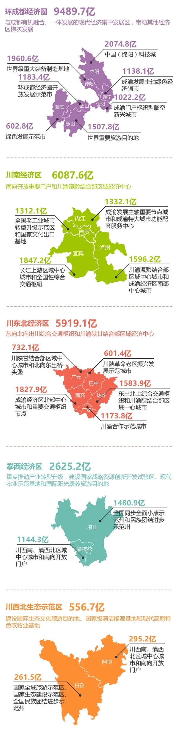 發(fā)展“多支”:環(huán)成都經(jīng)濟圈、川南經(jīng)濟區(qū)、川東北經(jīng)濟區(qū)、攀西經(jīng)濟區(qū)、川西北生態(tài)示范區(qū)。