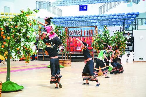 雅安市代表團(tuán)教練李鏡文告訴記者,《石炯諧博》表演項(xiàng)目依托當(dāng)?shù)匾图颐袼?,在黃果柑豐收的季節(jié),石棉縣彝族小伙、姑娘們?cè)诠掷锊烧S果柑時(shí)所產(chǎn)生的勞動(dòng)趣味競(jìng)技活動(dòng)的演繹,反映了少數(shù)民族地區(qū)經(jīng)濟(jì)發(fā)展、社會(huì)繁榮穩(wěn)定、各族人民安居樂業(yè)的生活和精神風(fēng)貌。