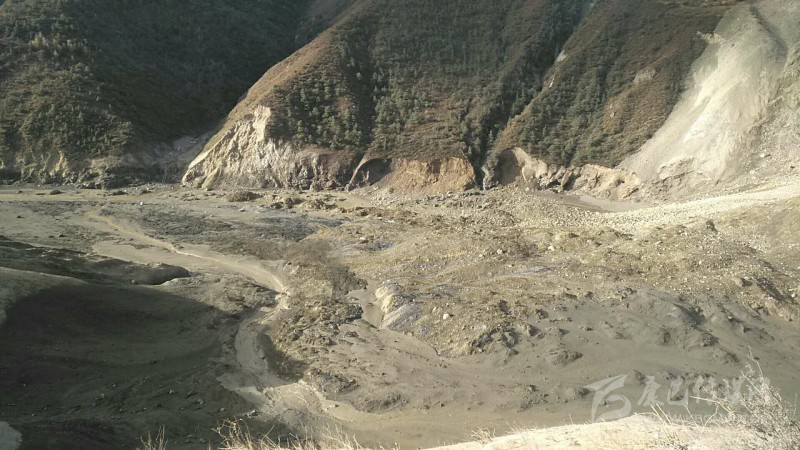 上午10點(diǎn)過,突擊隊(duì)抵達(dá)生公村一個山坡上,看見了堰塞體。隨后,突擊隊(duì)繼續(xù)出發(fā),下午5點(diǎn)過,突擊隊(duì)終于抵達(dá)了距離壩體約200米遠(yuǎn)的地方,并在這里用衛(wèi)星電話向后方播報了信息后,便攀上了高約70米,寬約200米的堰塞體實(shí)地查勘,并再次向后方匯報了情況。