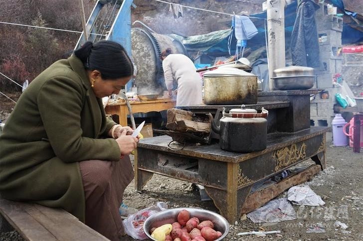 在四川甘孜藏族自治州白玉縣金沙鄉(xiāng)安置點,八吉村村民在準(zhǔn)備午飯(11月17日攝)。新華社記者 張海磊 攝