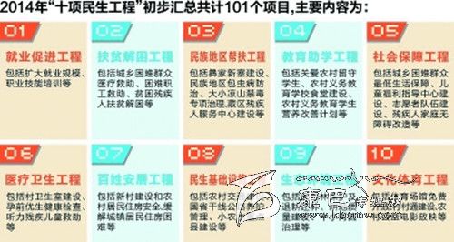 在征求各級部門、基層群眾意見的基礎(chǔ)上,今年“十項民生工程”已初步匯總101個項目,主要有:就業(yè)促進工程,包括擴大就業(yè)規(guī)模、職業(yè)技能培訓(xùn)等;扶貧解困工程,包括城鄉(xiāng)困難群眾醫(yī)療救助、困難職工救助等;民族地區(qū)幫扶工程,包括大小涼山禁毒專項治理、藏區(qū)殘疾人服務(wù)中心建設(shè)等;教育助學(xué)工程,包括農(nóng)村義務(wù)教育學(xué)校食堂建設(shè)等;社會保障工程,包括志愿者隊伍建設(shè)、殘疾人家庭無障礙改造等;醫(yī)療衛(wèi)生工程,包括孕前優(yōu)生健康檢查、聽力殘疾兒童救助等;百姓安居工程,包括農(nóng)村居民住房安全、緩解城鎮(zhèn)居民住房困難等;民生基礎(chǔ)設(shè)施工程,包括國省干線公路養(yǎng)護管理等;生態(tài)環(huán)境工程,包括耕地質(zhì)量建設(shè)、中小河流治理等;文化體育工程,包括體育場館免費開放等。