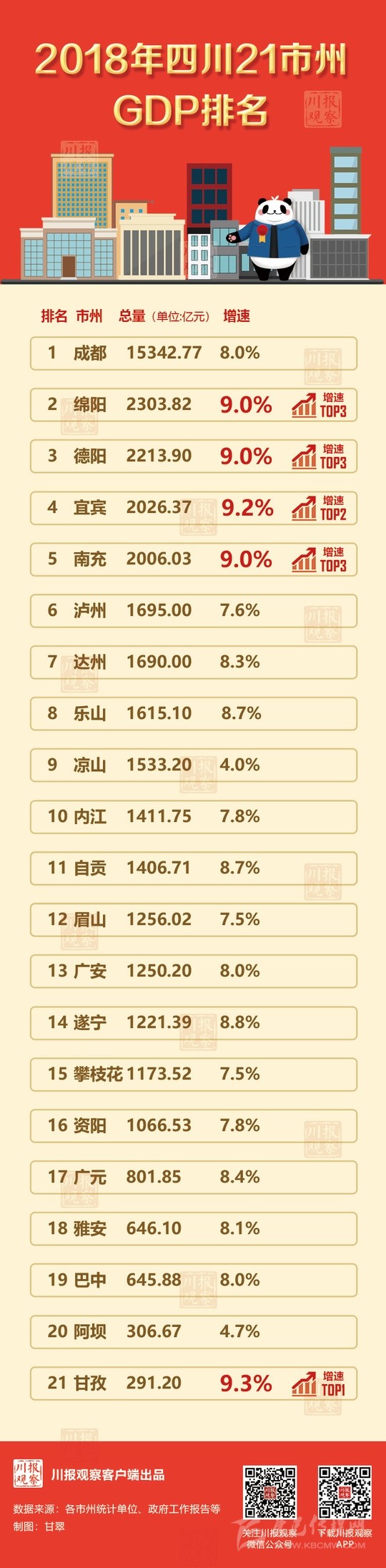 21個市州中,“主干”成都繼續(xù)“獨(dú)領(lǐng)風(fēng)騷”,以15342.77億元的成績牢牢占據(jù)“第一把交椅”。熟悉四川的朋友,對于成都的表現(xiàn)或許已經(jīng)習(xí)以為常。
