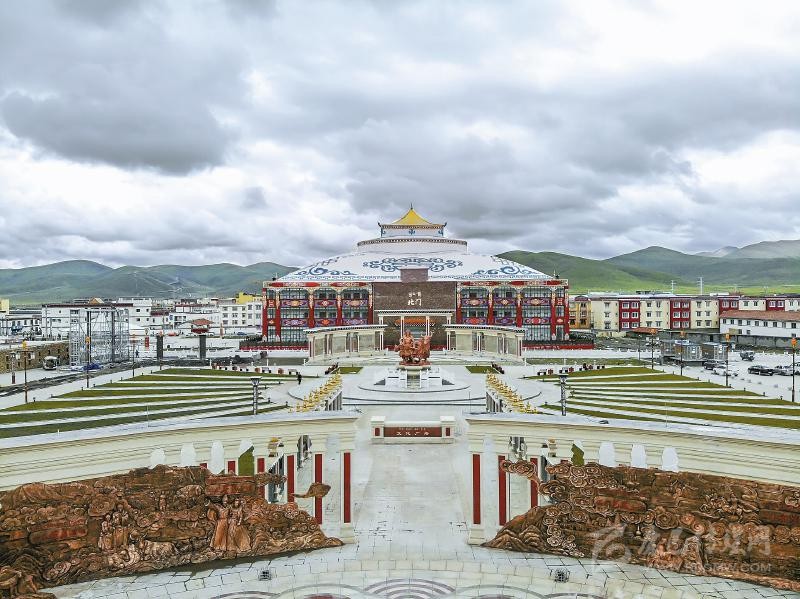 活動中心最“惹眼”的建筑,是一棟外形神似牧區(qū)帳篷的三層主體建筑。主體建筑的頂部,借鑒了石渠縣色須寺的外形設(shè)計,建筑外部的壁畫均為當?shù)厥止に嚾擞H手繪制?;顒又行牡膹V場上,以微縮的形式展現(xiàn)石渠縣最具代表性的景點,如石經(jīng)城、石經(jīng)墻等。