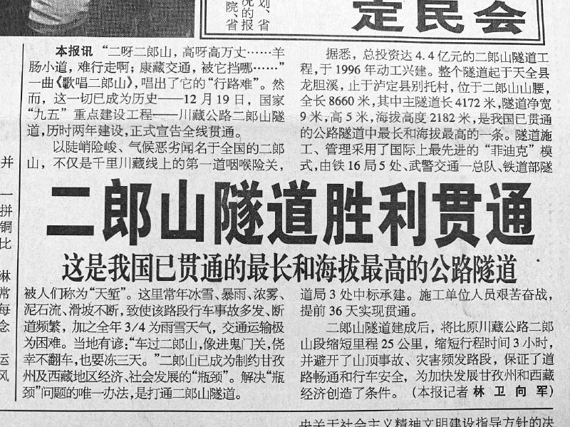 二郎山是川藏公路第一天險。1998年,當時全國最長和海拔最高的公路隧道——川藏公路二郎山隧道全線貫通,《四川日報》1998年12月21日第1版、23日第5版連續(xù)刊發(fā)報道,濃墨重彩地記錄了這一歷史時刻。日前,本報記者王眉靈和當年采寫川藏公路二郎山隧道全線貫通報道的老記者林衛(wèi)一起,重訪二郎山隧道,回顧進藏公路幾十年來的巨變。