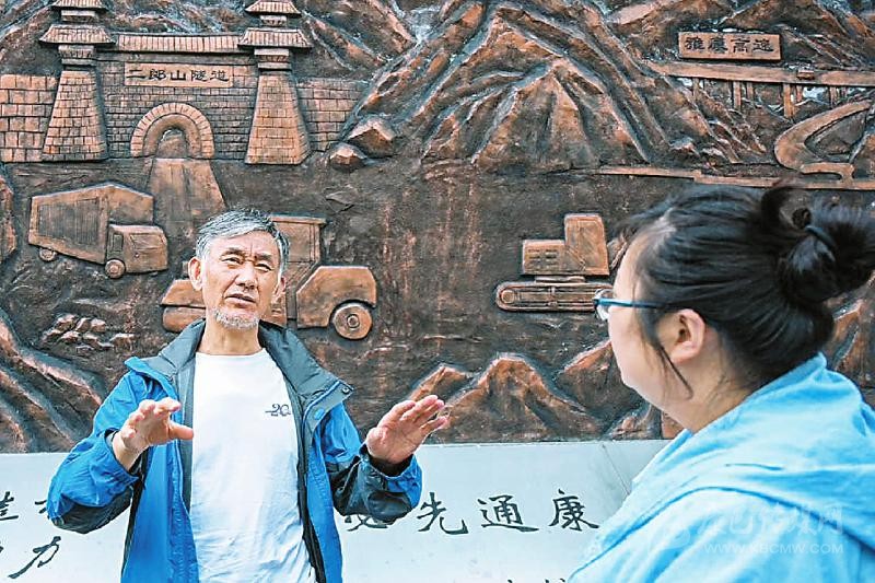 老二郎山隧道外,川報老記者林衛(wèi)(左)回憶當年的采訪情景。