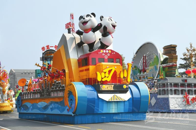 從造型設(shè)計來看,彩車底層是以江流托起古蜀文化的藝術(shù)浮雕;中層以中歐班列(成都)車頭模型以及災(zāi)后重建的天府新民居藝術(shù)浮雕和藏羌彝漢歌舞表演等構(gòu)成;上層以大熊貓、“華龍一號”模型等元素組成,展現(xiàn)了繁榮四川的壯美畫卷。全車共有三組六只大熊貓,分別置于彩車前段和后方兩側(cè)?!败囶^的兩只大熊貓名字取自‘天府三九大安逸走四川’中的‘安逸’二字?!?/p>