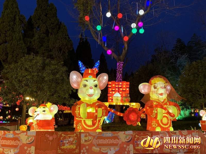 據(jù)成都武侯祠博物館工作人員介紹,“2020武侯祠成都大廟會(huì)”對(duì)燈組景觀和光影效果進(jìn)行了全面升級(jí),正門(mén)燈組主架構(gòu)以漢闕風(fēng)格和傳統(tǒng)吉祥圖案為基本元素,中為成都傳統(tǒng)民俗IP喜神主題的諸葛亮形象,兩側(cè)為兩只活潑可愛(ài)的生肖鼠,為游客送上“吉祥如意”和“鼠年大吉”的祝福。西區(qū)廣場(chǎng)和軸線兩大燈組分別以“喜神送寶”和“魅力天府”為主題,將生肖鼠和紅包、祥云、銀杏等吉祥元素相結(jié)合,營(yíng)造溫馨、浪漫和喜慶的節(jié)日氛圍,呈現(xiàn)出吉慶祥和、物豐民富、前程似錦的魅力天府景象。西區(qū)湖面“三顧草廬”大型燈組長(zhǎng)寬均達(dá)50米,高度超過(guò)20米,為歷屆廟會(huì)之最,形象上以大型彩燈描繪歷史故事,展示武侯祠作為“三國(guó)圣地”的厚重歷史底蘊(yùn),配合蓮花、仙鶴、祥云、福樹(shù)等點(diǎn)綴和流水追光,將宏大敘事和細(xì)節(jié)裝飾完美融合。