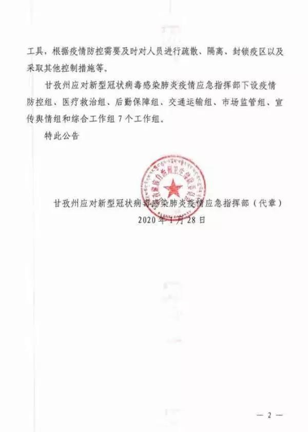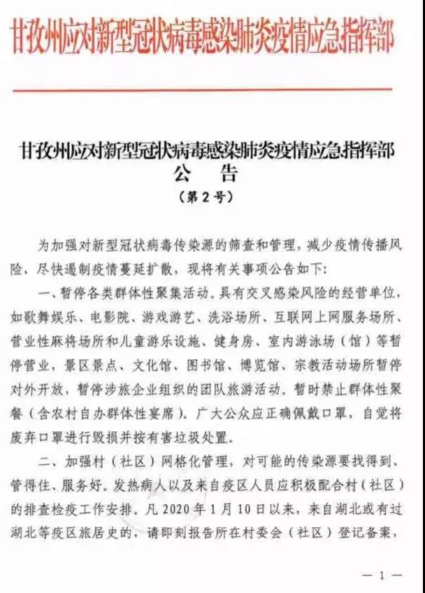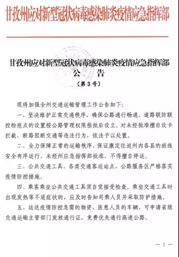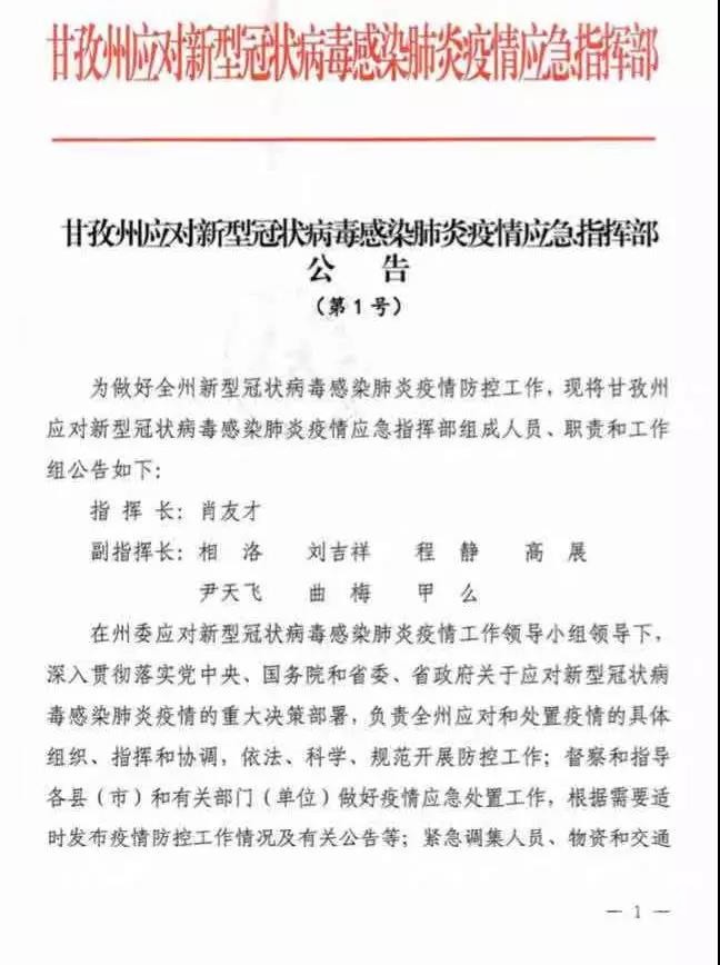 近日,甘孜州應(yīng)對(duì)新型冠狀病毒感染肺炎疫情應(yīng)急指揮部發(fā)布第1號(hào)、第2號(hào)、第3號(hào)公告。