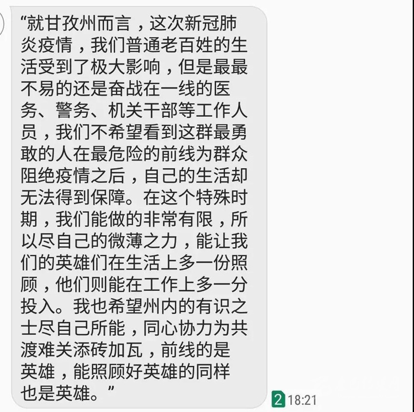 加勇一邊從兜里拿出1000元往鄉(xiāng)干部手中遞,一邊說到:“這個是我跟我兒子捐給國家的,錢不多,我們兩人一個人500,麻煩你們鄉(xiāng)上幫到捐一下。以前,我在擔任村干部期間,國家給了我和家人很多關懷和照顧,現(xiàn)在我們全中國都在齊心協(xié)力防治新型冠狀病毒感染的肺炎疫情,作為一個老黨員,還是原來的村支部書記,我們一家人想為國家盡點力,這個錢不多,但是我想能有捐一點算一點嘛。”