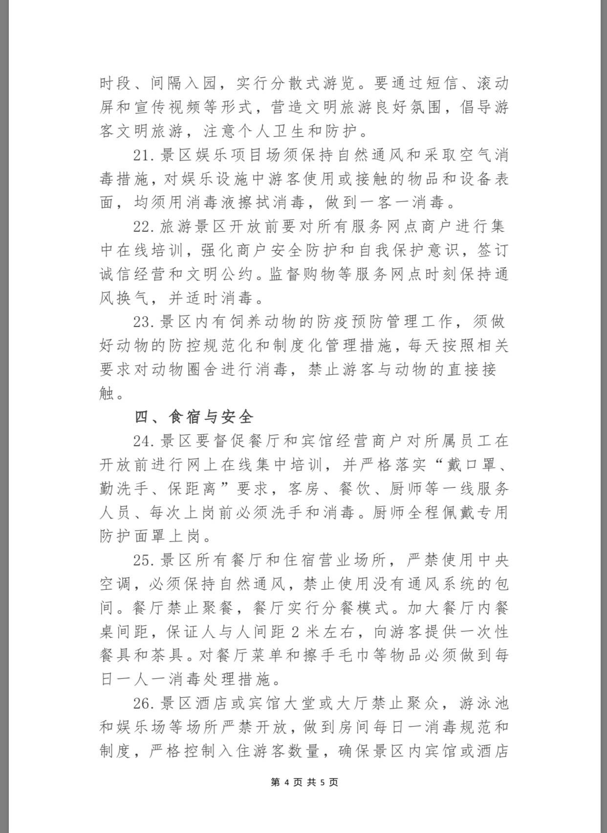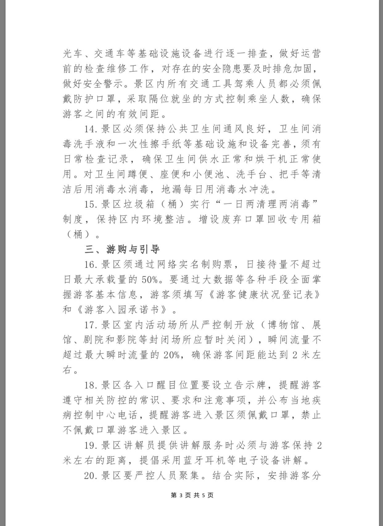 為保障景區(qū)安全有序恢復開放,景區(qū)游客服務中心和(志愿者或商業(yè))服務網(wǎng)點除放置免費中英文防治新冠肺炎的宣傳資料外,還要放置“本中心已消毒”告示,應備有75%的酒精棉球或其它消毒液等免費供游客使用。同時,景區(qū)內所有交通工具駕乘人員都必須佩戴防護口罩,采取隔位就坐的方式控制乘坐人數(shù),確保游客之間的有效間距,而垃圾箱(桶)則實行“一日兩清理兩消毒”制度,增設廢棄口罩回收專用箱(桶)。