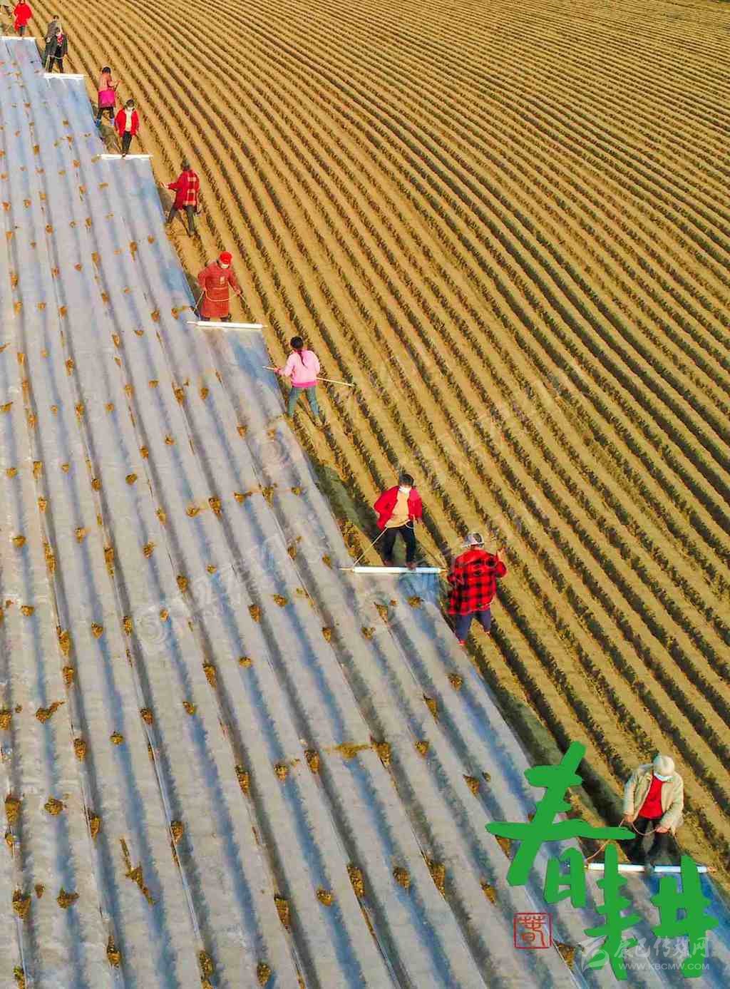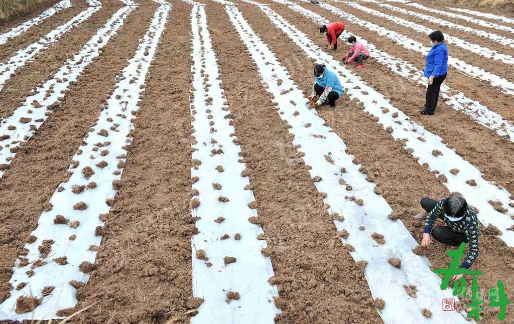 射洪市沱牌鎮(zhèn)桑樹林村,戴著口罩的農(nóng)戶正在地里播種、蓋膜。