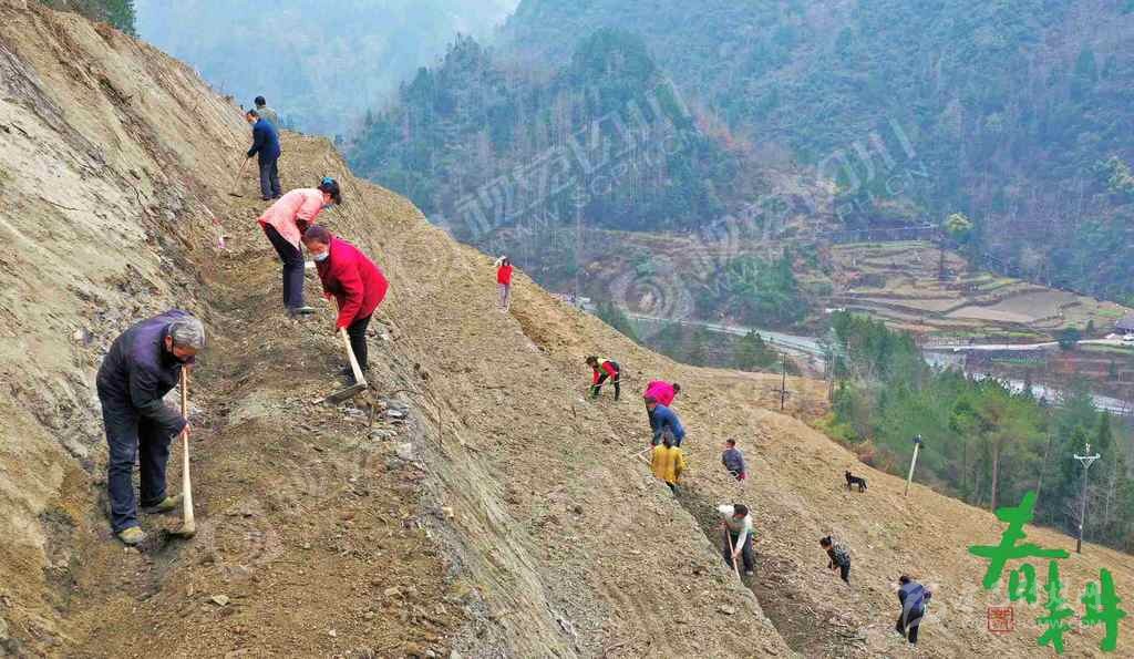 巴中市南江縣紅光鎮(zhèn)石寨村村民帶著口罩在開墾的荒坡地上開溝壘廂、覆蓋地膜,準(zhǔn)備栽植茶苗。