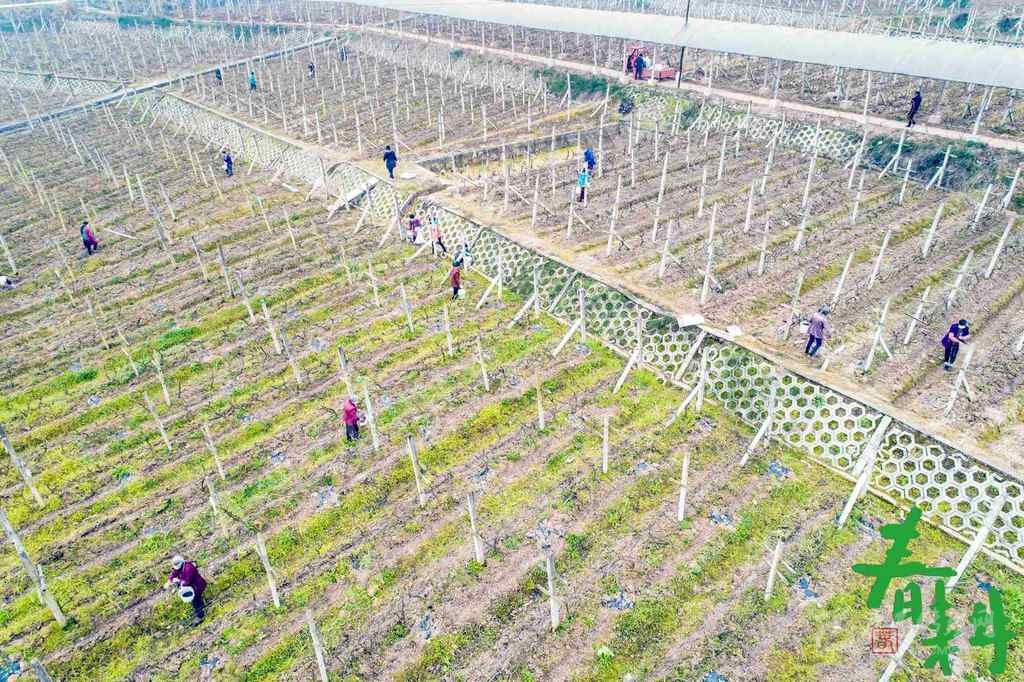 巴中市恩陽區(qū)上八廟鎮(zhèn)安居村的葡萄產(chǎn)業(yè)園里,產(chǎn)業(yè)員工佩戴口罩,分散在產(chǎn)業(yè)園里施肥。