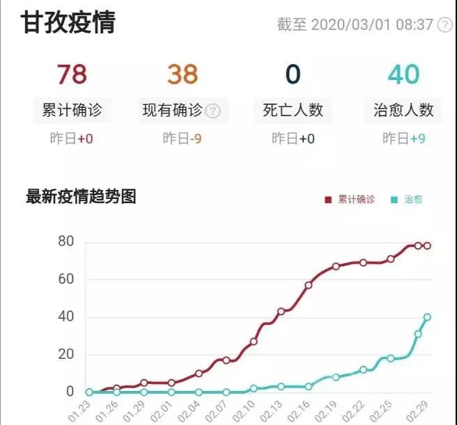 截至2月29日24時(shí)我州累計(jì)報(bào)告確診病例78例,累計(jì)治愈出院40人(道孚縣35人、康定市2人、色達(dá)縣2人、稻城縣1人),其余38人(重癥4例,危重癥1例)均在定點(diǎn)醫(yī)院隔離治療,231名密切接觸者正在接受醫(yī)學(xué)觀察。我州除道孚縣“五鄉(xiāng)一鎮(zhèn)”外,其余17個(gè)縣(市)連續(xù)26天無(wú)確診病例報(bào)告。