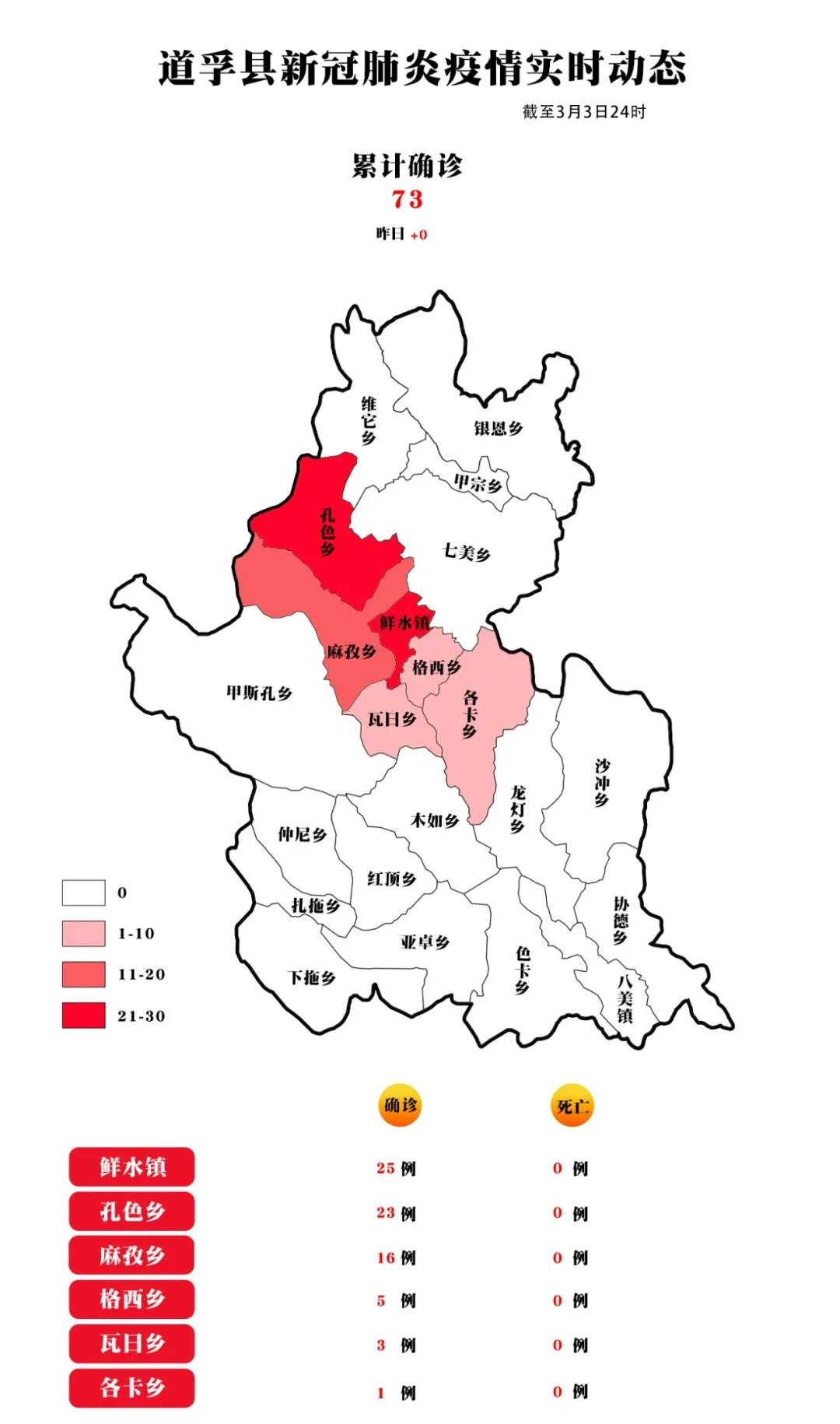 截至3月3日24時,我州累計報告確診病例78例,累計治愈出院53人(道孚縣48人、康定市2人、色達縣2人、稻城縣1人),其余25人均在定點醫(yī)院隔離治療,203名密切接觸者正在接受醫(yī)學觀察。我州道孚縣連續(xù)5天無確診病例報告,其余17個縣(市)連續(xù)29天無確診病例報告。各縣(市)確診病例情況表疫情實時追蹤(截至2020年3月3日24時)縣(市)累計病例新增病例道孚縣730康定市20色達縣20稻城縣10溫馨提示: