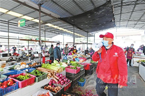 “喇叭哥”志愿服務(wù)很帶勁邱時(shí)春在農(nóng)貿(mào)市場(chǎng)用喇叭喊話,提醒大家戴好口罩。