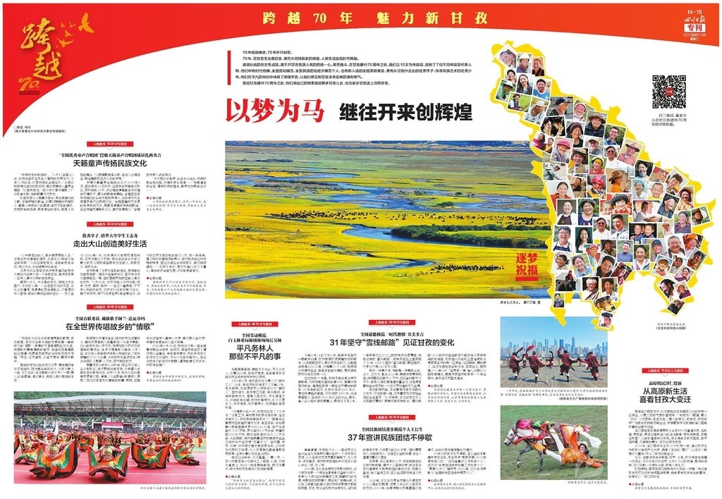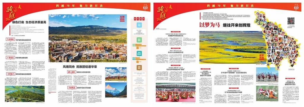 開(kāi)篇連版以手繪甘孜建州70周年10件大事記鋪底,部分金山、碉樓等民族元素做點(diǎn)綴。版面上有州委州政府的署名文章,還有川報(bào)首席記者所寫《光輝歲月 砥礪奮進(jìn)》70年綜述,并鏈接二維碼,可通過(guò)手機(jī)掃碼看甘孜70年變遷。
