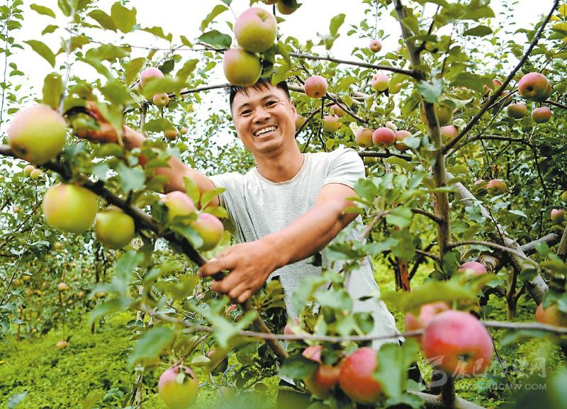 瀘定縣烹壩鎮(zhèn)固包村,致富帶頭人張雪峰正在田園采摘蘋(píng)果。