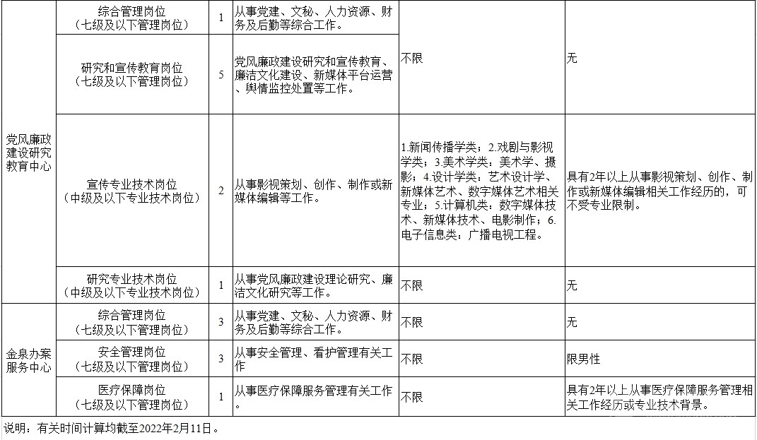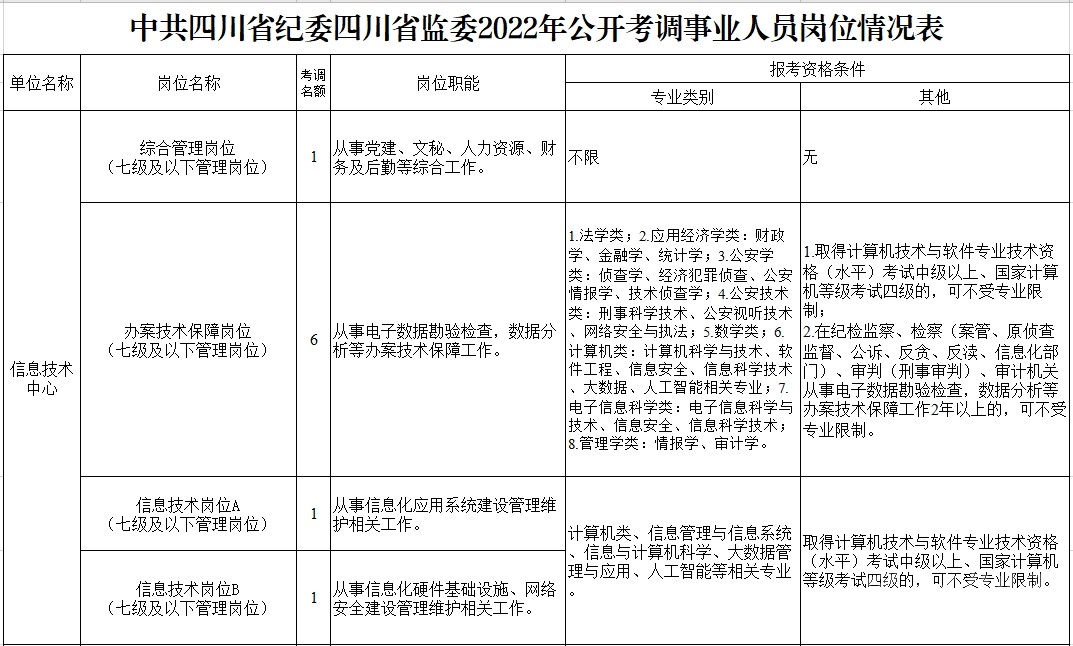 考調(diào)名額 考調(diào)事業(yè)人員25名。其中,信息技術(shù)中心管理崗位9名,黨風(fēng)廉政建設(shè)研究教育中心管理崗位6名、專(zhuān)業(yè)技術(shù)崗位3名,金泉辦案服務(wù)中心管理崗位7名。 考調(diào)對(duì)象及條件 考調(diào)對(duì)象 全省范圍內(nèi)行政單位或參公事業(yè)單位一級(jí)主任科員(含)以下職級(jí)及相當(dāng)職務(wù)層次人員;縣級(jí)及以上公益一類(lèi)或全額撥款事業(yè)單位管理崗位七級(jí)及以下職員、專(zhuān)業(yè)技術(shù)崗位中級(jí)及以下工作人員。 考調(diào)條件 具有良好的政治素質(zhì)、專(zhuān)業(yè)素養(yǎng),品行端正,實(shí)績(jī)突出,群眾公認(rèn)。 中共黨員。 全日制大學(xué)本科及以上學(xué)歷,并取得相應(yīng)學(xué)士及以上學(xué)位。 年齡35周歲以下(1986年2月11日及以后出生)。 歷年年度考核均為合格(稱(chēng)職)及以上。 身體心理健康,具有正常履行職責(zé)的身體條件和心理素質(zhì)。 符合報(bào)考崗位規(guī)定的資格條件,詳見(jiàn)《中共四川省紀(jì)委四川省監(jiān)委2022年公開(kāi)考調(diào)事業(yè)人員崗位情況表》(附后)。 符合法律、法規(guī)規(guī)定的其他條件。 有關(guān)時(shí)間計(jì)算均截至2022年2月11日。 具有下列情形之一的,不得報(bào)考: 被依法列為失信聯(lián)合懲戒對(duì)象的。 涉嫌違紀(jì)違法正在接受有關(guān)專(zhuān)門(mén)機(jī)關(guān)審查尚未作出結(jié)論的。 受過(guò)黨紀(jì)政務(wù)處分或司法機(jī)關(guān)刑事處罰的。 受到誡勉、組織處理等影響期未滿(mǎn)或期滿(mǎn)影響使用的。 按照有關(guān)規(guī)定,到定向單位工作未滿(mǎn)服務(wù)年限或有其他限制性規(guī)定的。 尚在試用期的。 按照相關(guān)規(guī)定應(yīng)當(dāng)回避的。 法律、法規(guī)規(guī)定的其他情形。 報(bào)名及打印準(zhǔn)考證 2022年2月22日上午8:00至2月26日下午18:00,報(bào)名人員登錄四川省人力資源和社會(huì)保障廳官網(wǎng)(http://rst.sc.gov.cn/)首頁(yè)“人事考試”專(zhuān)欄進(jìn)行網(wǎng)上報(bào)名,每人限報(bào)一個(gè)崗位。 對(duì)報(bào)名人員進(jìn)行網(wǎng)上資格初審,通過(guò)資格初審者可于2022年3月1日上午8:00至3月2日下午18:00,登陸報(bào)名系統(tǒng)打印筆試準(zhǔn)考證。 考試 考試分筆試和面試。其中,信息技術(shù)崗位A、信息技術(shù)崗位B、宣傳專(zhuān)業(yè)技術(shù)崗位需加試專(zhuān)業(yè)測(cè)試。 根據(jù)筆試情況,擇優(yōu)確定進(jìn)入面試的人選,并適時(shí)開(kāi)展資格復(fù)審和心理素質(zhì)測(cè)試。資格復(fù)審、心理素質(zhì)測(cè)試、面試時(shí)間和地點(diǎn)另行電話(huà)通知。 考察、體檢及試用 考察 根據(jù)考試情況,擇優(yōu)差額確定進(jìn)入考察對(duì)象,深入考察了解人選政治表現(xiàn)、工作能力、廉潔自律和性格特點(diǎn)等。 體檢 根據(jù)考察情況和職位要求,擇優(yōu)等額確定進(jìn)入體檢人選,參照《公務(wù)員錄用體檢通用標(biāo)準(zhǔn)(試行)》進(jìn)行體檢。 頂崗試用 綜合人選考試成績(jī)、考察情況,根據(jù)工作需要和人崗相適原則,擇優(yōu)確定頂崗試用人選。 調(diào)入 試用期滿(mǎn)后,根據(jù)考調(diào)名額和試用期間表現(xiàn),研究確定擬調(diào)人員,經(jīng)公示后按規(guī)定程序辦理調(diào)入手續(xù)。 注意事項(xiàng) 報(bào)考者應(yīng)保證提供真實(shí)、準(zhǔn)確、全面的個(gè)人信息和資料,如有弄虛作假的行為,將按有關(guān)規(guī)定嚴(yán)肅處理。 資格審查貫穿考調(diào)全過(guò)程,任一環(huán)節(jié)發(fā)現(xiàn)有不符合考調(diào)條件的,取消考調(diào)資格。 報(bào)名時(shí)請(qǐng)按要求填寫(xiě)本人手機(jī)號(hào)碼,并保持通訊暢通。未入圍下一環(huán)節(jié)人員,不再另行通知。 進(jìn)入資格復(fù)審者,需由有干部管理權(quán)限的主管部門(mén)出具同意考調(diào)的書(shū)面意見(jiàn)并加蓋公章。 嚴(yán)明考調(diào)紀(jì)律,報(bào)名者不得托人說(shuō)情、打招呼,一經(jīng)發(fā)現(xiàn)即取消資格。 遵守疫情防控相關(guān)規(guī)定,服從工作人員安排。 同時(shí),四川省紀(jì)委監(jiān)委還提供相關(guān)咨詢(xún)電話(huà):028—62555435;62555354。 (點(diǎn)擊查看大圖)