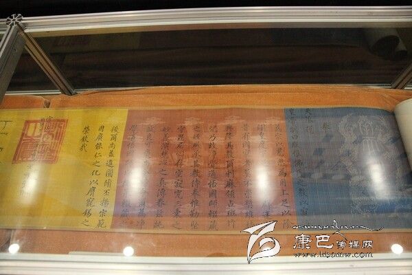 據(jù)介紹,明成祖永樂十一年封誥為國(guó)家一級(jí)文物,系明永樂帝成祖朱棣于明永樂十一年(1413)敕封噶瑪噶舉楚布寺第二世司徒活佛曲吉降村為“灌頂圓通妙濟(jì)國(guó)師”時(shí)頒賜的。該封誥質(zhì)地為宮廷誥文專用彩色云綾紋錦,由藍(lán)、明黃、白、灰、褐五色錦帛分段依次裱接為手卷形制。封誥用漢藏兩種文字墨書,漢文居右、直行,共20行、145字、楷書;藏文居左、橫行、共四行、行書。封誥右藍(lán)色錦帛織二龍及“奉天誥命”四字。該封誥真實(shí)地記載了明王朝敕封噶瑪噶舉派高僧,有效管理藏區(qū)地方事務(wù)的史實(shí),對(duì)研究明代中央王朝與藏區(qū)關(guān)系具有重要的史料價(jià)值。