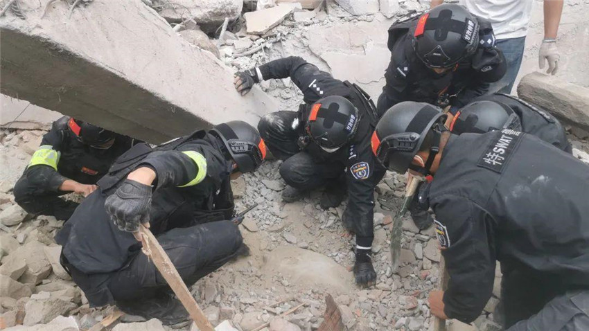 14時(shí)20分,翻山越嶺奔襲的240名甘孜特警抵達(dá)磨西鎮(zhèn)。“就在這兒!”“就在這兒!”15時(shí)左右,幾名特警來(lái)到海螺溝一處大型搜救設(shè)備無(wú)法進(jìn)入的區(qū)域,為避免鐵鍬傷人,硬是徒手刨土,從斷壁殘?jiān)g救出一名被困群眾,緊急送往醫(yī)院搶救。
