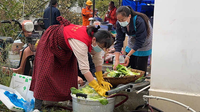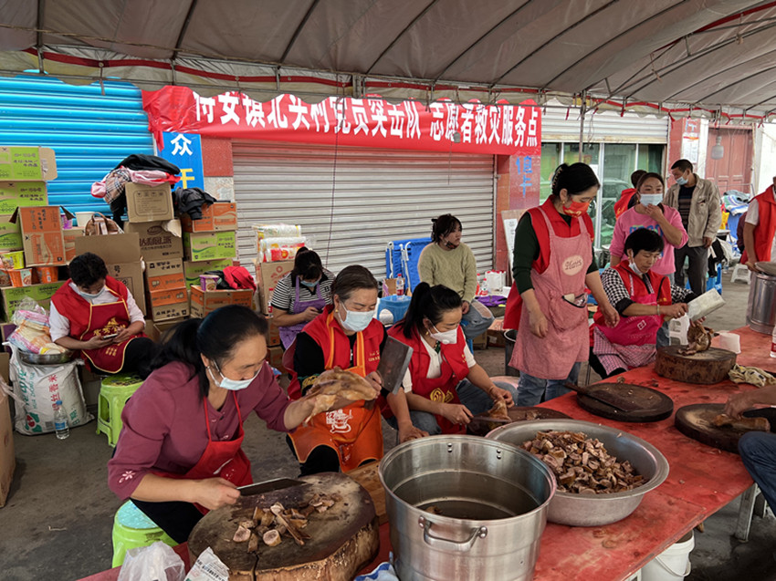 在得妥鎮(zhèn)北頭村的路旁,來自瀘定縣冷磧鎮(zhèn)桐子林村的李星芳和其他志愿者一起忙著切菜煮飯。她告訴記者,地震發(fā)生后,我主動報名加入志愿者團隊?!拔覀冞@個點上除了政府發(fā)放的物資,還有很多附近村民和好心人送來的菜肉和水果,大家都在用自己的行動出一份力?!闭诿χ胁说闹驹刚吆樾l(wèi)群說。就在記者采訪時,在北頭村開飯館的易姝宏一家送來了鹵菜、排骨和新鮮蔬菜,記賬員茍有成忙著清點數(shù)量并記錄在冊?!暗卣鸷?,爸媽把年邁的奶奶送到瀘定縣城孃孃家,我也向單位請了假,今天我們一起趕回來在這里幫忙”。