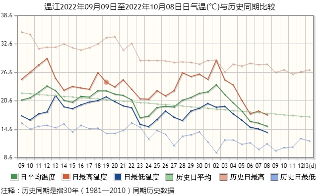 在盆地區(qū),溫江國(guó)家氣象站的觀測(cè)顯示,10月2日以來(lái),當(dāng)?shù)氐娜掌骄鶜鉁?、日最高氣溫、日最低氣溫都是一路快速下行,使前期偏高的氣溫向著歷史均值快速回歸。