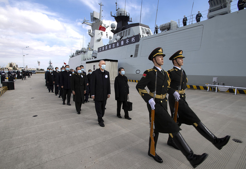 中國人民解放軍海軍揚(yáng)州艦伏波靜臥,艦上官兵分區(qū)列隊(duì)、肅立舷邊。揚(yáng)州是江澤民同志的故鄉(xiāng)。今天,這艘以揚(yáng)州命名的軍艦,以最高禮儀送別這位為黨和人民建立了不朽功勛的卓越領(lǐng)導(dǎo)人。江澤民同志的親屬捧護(hù)著骨灰登上揚(yáng)州艦。海軍笛吹響,儀仗隊(duì)持槍肅立,行注目禮。當(dāng)揚(yáng)州艦起航時,軍港內(nèi)所有艦船汽笛長鳴,響徹云霄。