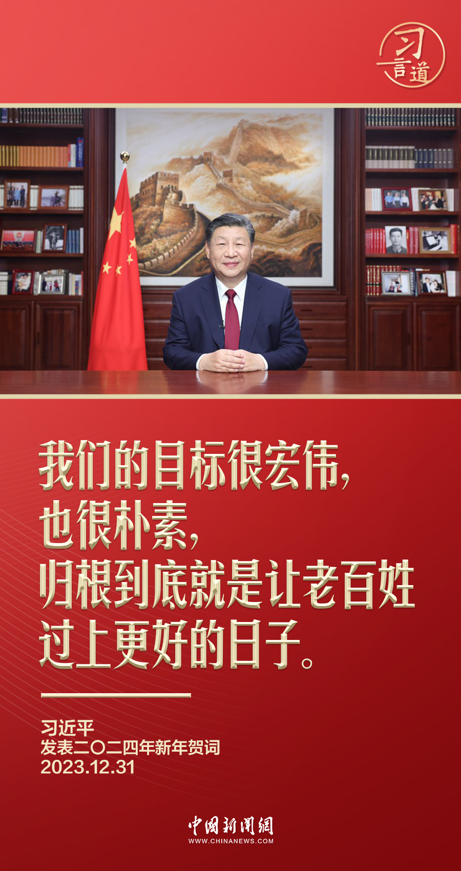 一元復(fù)始,歲律更新。12月31日晚,國(guó)家主席習(xí)近平的2024年新年賀詞如約而至。在賀詞中,習(xí)近平再次強(qiáng)調(diào)中國(guó)共產(chǎn)黨孜孜以求的目標(biāo)——“讓老百姓過(guò)上更好的日子”。