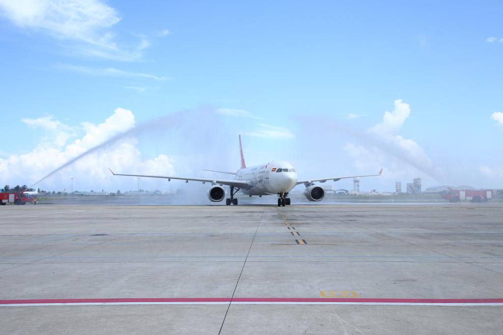 ??2023年1月18日,中國首都航空J(rèn)D455航班在馬爾代夫馬累維拉納國際機場接受水門禮。