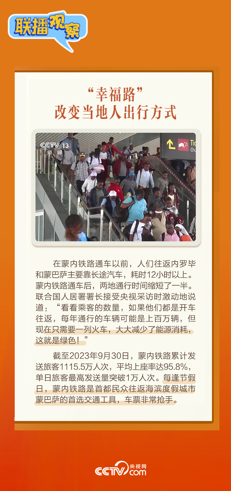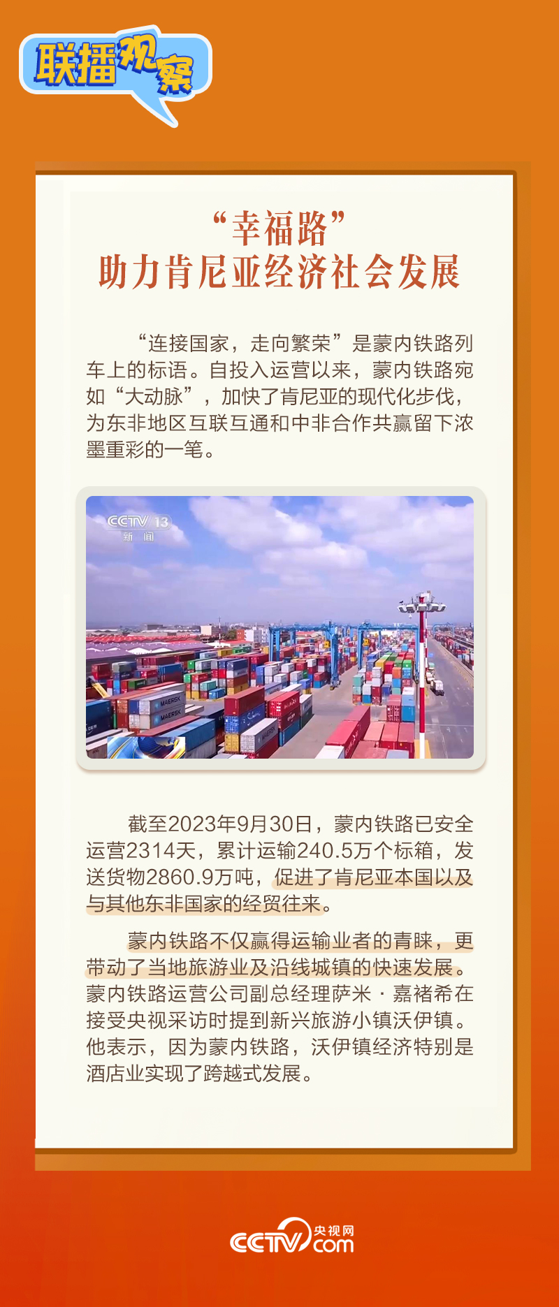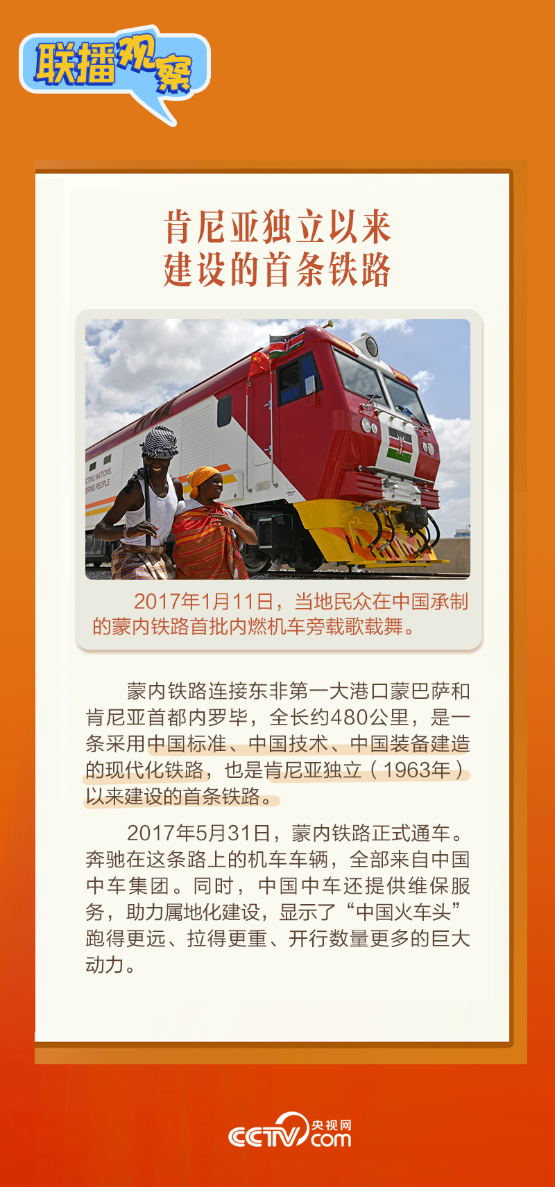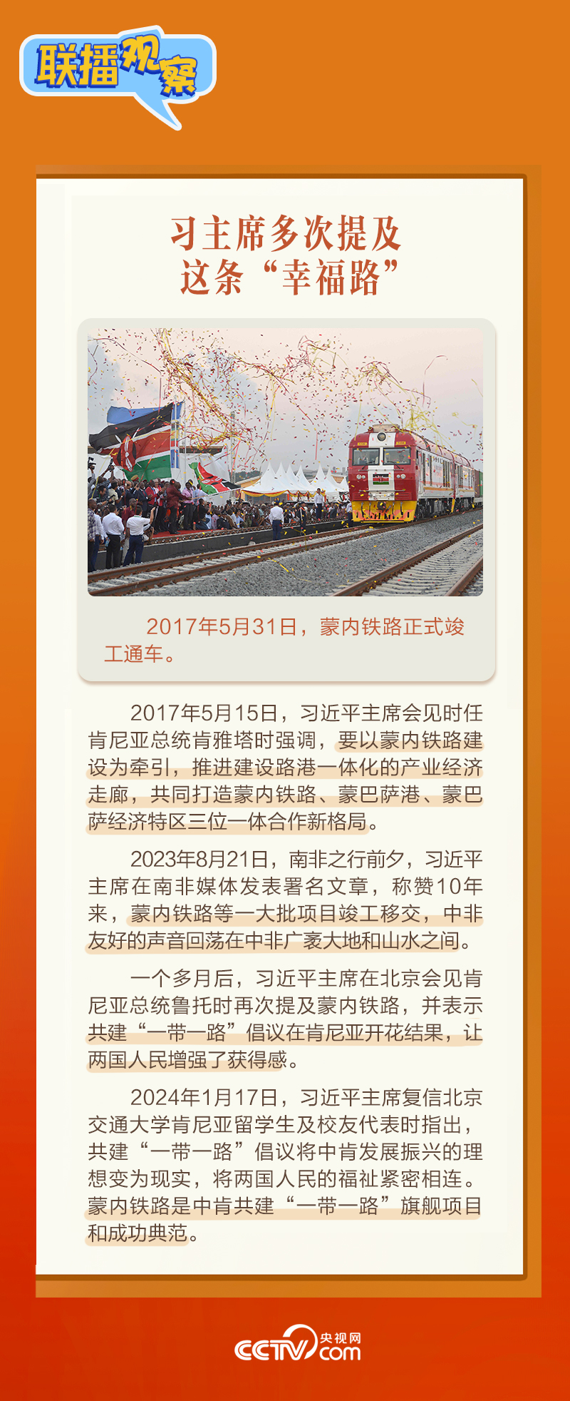 此前,習(xí)主席在外事活動(dòng)中多次提及蒙內(nèi)鐵路,《新聞聯(lián)播》也持續(xù)關(guān)注這條路的建設(shè)及開通后的運(yùn)營情況。這條“幸福路”有何特別之處,習(xí)主席為何頻頻提及?它的建成通車給當(dāng)?shù)貛砟男┳兓??《?lián)播觀察》邀您一同了解。