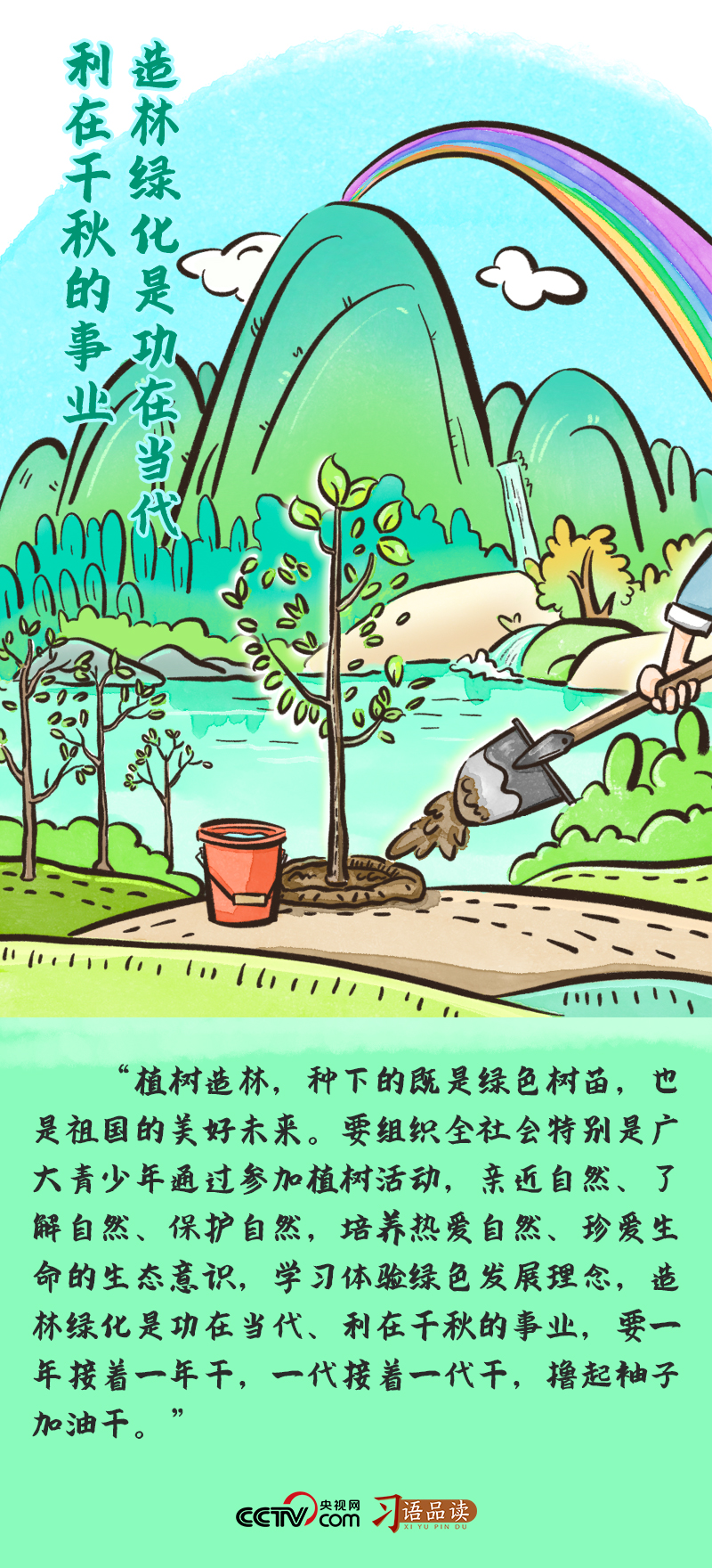 2017年3月29日,在參加首都義務植樹活動時,總書記強調:“植樹造林,種下的既是綠色樹苗,也是祖國的美好未來。要組織全社會特別是廣大青少年通過參加植樹活動,親近自然、了解自然、保護自然,培養(yǎng)熱愛自然、珍愛生命的生態(tài)意識,學習體驗綠色發(fā)展理念,造林綠化是功在當代、利在千秋的事業(yè),要一年接著一年干,一代接著一代干,擼起袖子加油干?!?/p>