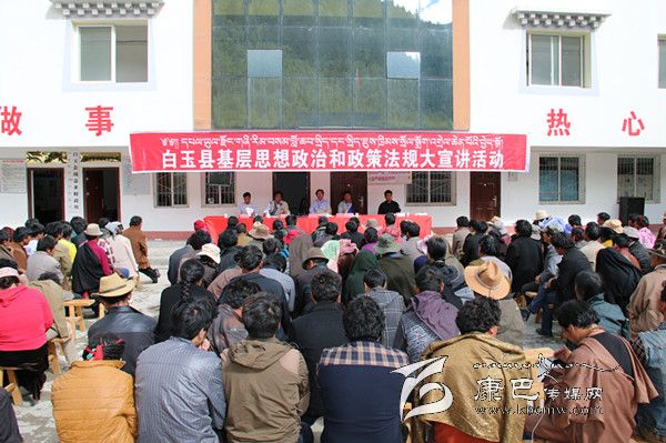 ?。冈碌陌子瘢胰债?dāng)頭,秋高氣爽。31日上午,絨蓋鄉(xiāng)政府大院內(nèi),白玉縣基層思想政治和政策法規(guī)大宣講活動(dòng)正在這里精彩“上演”,400多名前來(lái)“聽(tīng)課”的各村群眾正津津有味地品味著縣宣講團(tuán)成員松吉尼瑪通俗易懂的藏語(yǔ)大宣講。從黨的十八大到十八屆三中全會(huì)精神,從糧食直補(bǔ)到低保、新農(nóng)保,從養(yǎng)老保險(xiǎn)、殘疾人幫扶到相關(guān)法律法規(guī),宣講者深入淺出,傾聽(tīng)者全神貫注。