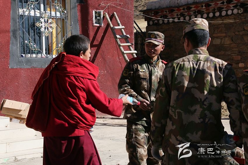 27日上午,記者一行來(lái)到金龍寺,看見(jiàn)院子里已經(jīng)搭起了一排排整齊的救災(zāi)棉帳篷,當(dāng)?shù)馗刹亢臀渚俦聫R僧人一道加固帳篷,僧人們從自己的帳篷里抱出礦泉水,送到武警戰(zhàn)士們手中。