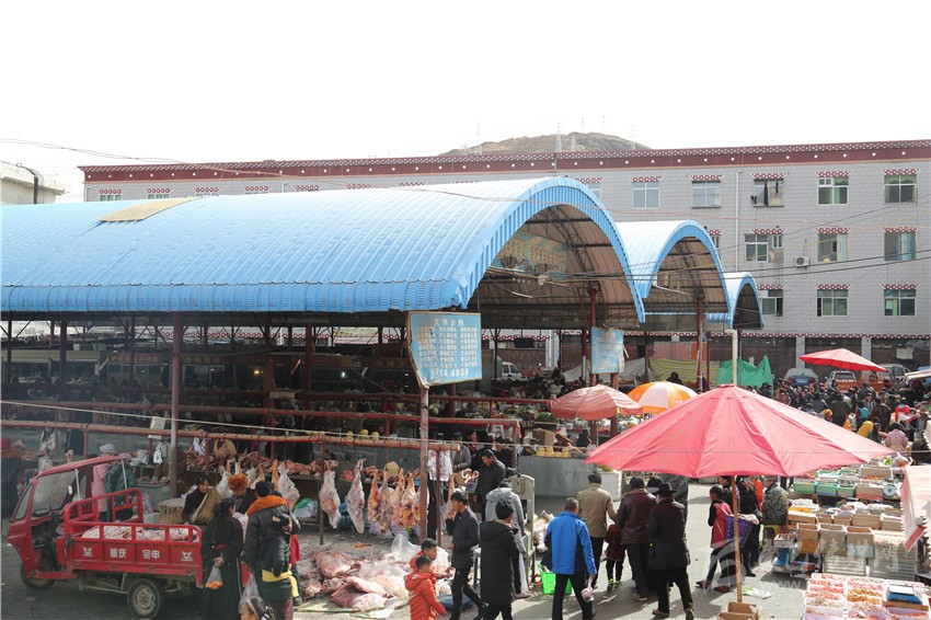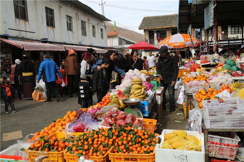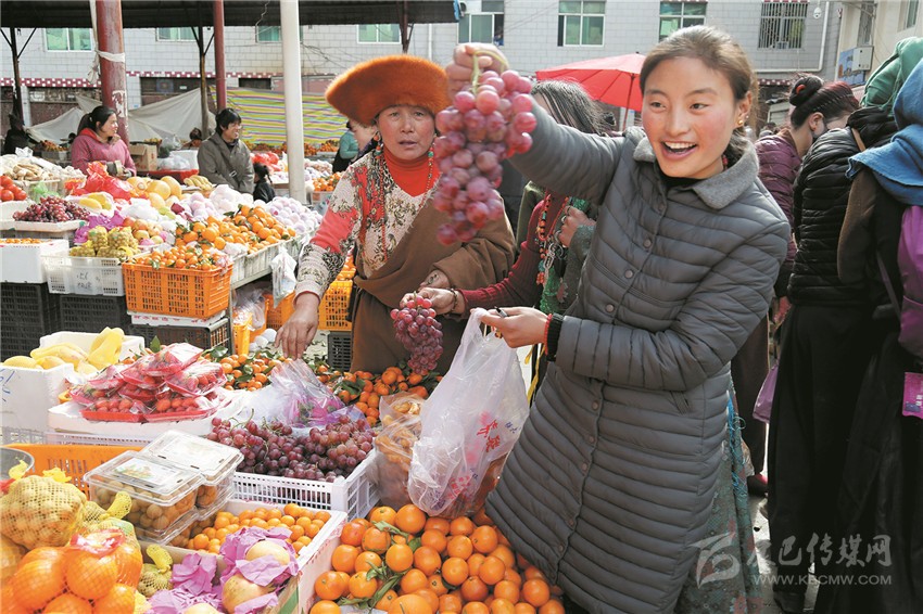 新都鎮(zhèn)格色村的丹真大哥和老伴兒其吉牽著8歲的孫子正在干果店里挑選各類干果,身后的背簍里水果、蔬菜、酥油、牛肉等農(nóng)畜產(chǎn)品以及中國結、年畫、對聯(lián)、掛圖等吉祥的節(jié)日物品應有盡有。